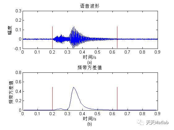 %频带方差端点检测M1_009.wav,enframe.m放在当前路径clear all;[x,fs,bits]=wavread('M1_009.wav');x=filter([1 -0.95],1,x);%对语音进行预加重,x[n]=y[n]-0.95y[n-1]L=320; %窗长FrameLen=320;FrameInc=160;%[f]=enframe(x,hamming(320,'periodic'),FrameInc);%加汉明窗[framenum,f]=enframe(x,FrameLen,FrameInc);%[framenum,L]=size(f);%显示帧数P=framenum;%总帧数%求每帧的频带方差,用数组Dvar存储,第i个元素为第i帧的频带方差for ii=1:Ps=f(ii,:);% 取出第ii帧语音样值S=abs(fft(s));%该帧的幅度频谱S=S(1:FrameLen/2);%取正频率成分,即频谱左边那部分Dvar(ii)=var(S)+eps;%计算每帧的频带方差end%%%观察frameTime=(((1:P)-1)*FrameInc+FrameLen/2)/fs;%%frameTime是数组,长度为帧长,第i个元素值是第i帧中间那个样值对应的时间figuresubplot(2,1,1)plot((0:length(x)-1)/fs,x);xlabel('时间/s');ylabel('幅度');title('语音信号');subplot(2,1,2)plot(frameTime,Dvar);%画出各帧的频带方差值,从而预估起点和终点的帧序号及alpha1,alpha2大小xlabel('时间/s');ylabel('幅度');title('频带方差值');%%%%取前导帧的频带方差值的平均值MR=mean(Dvar(1:5));% 取1-5帧做背景噪声的频带方差的平均值的2倍为门限值MR=2*MR;cx1=0;%检测出的起点帧号cx2=0;%检测出的终点帧号flag1=0;flag2=0;for i=1:P-3if (Dvar(i)>MR)&&(Dvar(i+1)>MR)&&(Dvar(i+2)>MR)&&(Dvar(i+3)>MR)&&(flag1==0)cx1=i;flag1=1;endendfor i=cx1+1:P-3if (Dvar(i)<MR)&&(Dvar(i+1)<MR)&&(Dvar(i+2)<MR)&&(Dvar(i+3)<MR)&&(flag2==0)cx2=i-1;flag2=1;endendcx1cx2frameTime(cx1)frameTime(cx2)figure%显示图形subplot(211),plot((0:length(x)-1)/fs,x);title('语音波形');xlabel({'时间/s' ; '(a)'});ylabel('幅度');line([frameTime(cx1),frameTime(cx1)],[min(x),max(x)],'color','r');line([frameTime(cx2),frameTime(cx2)],[min(x),max(x)],'color','r');subplot(212),plot(frameTime,Dvar);title('频带方差值');xlabel({'时间/s' ; '(b)'});ylabel('频带方差值');line([frameTime(cx1),frameTime(cx1)],[min(Dvar),max(Dvar)],'color','r');line([frameTime(cx2),frameTime(cx2)],[min(Dvar),max(Dvar)],'color','r');%%%%%%思考1:设定双门限,即起点和终点的判定门限大小是不同的%%%%%%思考2:带噪情况下效果如果?换别的语音效果如何?