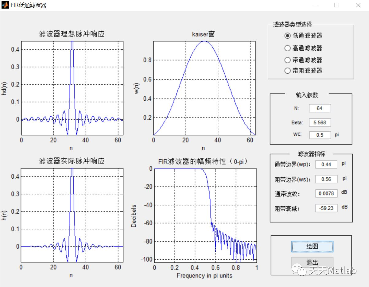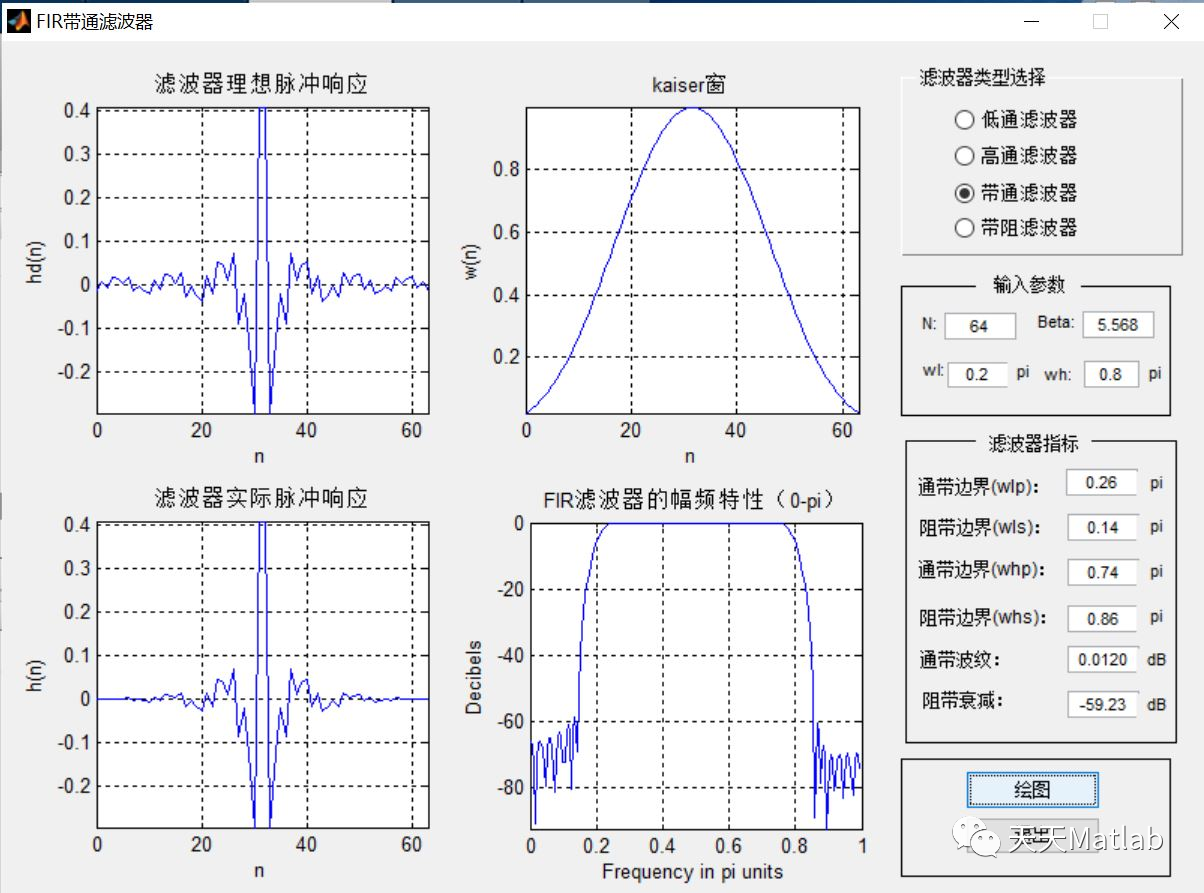 %--------------------------------------------------------------------------%利用kaiser窗设计带通滤波器m文件%默认输入参数: N=64% beta=5.568% wl=0.2% wh=0.8%输出参数: 低通带边界(wlh)% 低阻带边界(wls)% 高通带边界(whp)% 高阻带边界(whs)% 通带波纹% 阻带衰减%--------------------------------------------------------------------------function varargout = bpfilter(varargin)% BPFILTER M-file for bpfilter.fig% BPFILTER, by itself, creates a new BPFILTER or raises the existing% singleton*.%% H = BPFILTER returns the handle to a new BPFILTER or the handle to% the existing singleton*.%% BPFILTER('CALLBACK',hObject,eventData,handles,...) calls the local% function named CALLBACK in BPFILTER.M with the given input arguments.%% BPFILTER('Property','Value',...) creates a new BPFILTER or raises the% existing singleton*. Starting from the left, property value pairs are% applied to the GUI before bpfilter_OpeningFunction gets called. An% unrecognized property name or invalid value makes property application% stop. All inputs are passed to bpfilter_OpeningFcn via varargin.%% *See GUI Options on GUIDE's Tools menu. Choose "GUI allows only one% instance to run (singleton)".%% See also: GUIDE, GUIDATA, GUIHANDLES% Edit the above text to modify the response to help bpfilter% Last Modified by GUIDE v2.5 29-Jun-2007 13:03:07% Begin initialization code - DO NOT EDITgui_Singleton = 1;gui_State = struct('gui_Name', mfilename, ...'gui_Singleton', gui_Singleton, ...'gui_OpeningFcn', @bpfilter_OpeningFcn, ...'gui_OutputFcn', @bpfilter_OutputFcn, ...'gui_LayoutFcn', [] , ...'gui_Callback', []);if nargin & isstr(varargin{1})gui_State.gui_Callback = str2func(varargin{1});endif nargout[varargout{1:nargout}] = gui_mainfcn(gui_State, varargin{:});elsegui_mainfcn(gui_State, varargin{:});end% End initialization code - DO NOT EDIT% --- Executes just before bpfilter is made visible.function bpfilter_OpeningFcn(hObject, eventdata, handles, varargin)% This function has no output args, see OutputFcn.% hObject handle to figure% eventdata reserved - to be defined in a future version of MATLAB% handles structure with handles and user data (see GUIDATA)% varargin command line arguments to bpfilter (see VARARGIN)% Choose default command line output for bpfilterhandles.output = hObject;% Update handles structureguidata(hObject, handles);% UIWAIT makes bpfilter wait for user response (see UIRESUME)% uiwait(handles.figure1);%--------------------------------------------------------------------------function edit_beta_Callback(hObject, eventdata, handles)% hObject handle to edit_beta (see GCBO)% eventdata reserved - to be defined in a future version of MATLAB% handles structure with handles and user data (see GUIDATA)% Hints: get(hObject,'String') returns contents of edit_beta as text% str2double(get(hObject,'String')) returns contents of edit_beta as a double% --- Executes during object creation, after setting all properties.function edit_wl_CreateFcn(hObject, eventdata, handles)% hObject handle to edit_wl (see GCBO)% eventdata reserved - to be defined in a future version of MATLAB% handles empty - handles not created until after all CreateFcns called% Hint: edit controls usually have a white background on Windows.% See ISPC and COMPUTER.if ispcset(hObject,'BackgroundColor','white');elseset(hObject,'BackgroundColor',get(0,'defaultUicontrolBackgroundColor'));endfunction edit_wl_Callback(hObject, eventdata, handles)% hObject handle to edit_wl (see GCBO)% eventdata reserved - to be defined in a future version of MATLAB% handles structure with handles and user data (see GUIDATA)% Hints: get(hObject,'String') returns contents of edit_wl as text% str2double(get(hObject,'String')) returns contents of edit_wl as a double% --- Executes during object creation, after setting all properties.function edit_wlp_CreateFcn(hObject, eventdata, handles)% hObject handle to edit_wlp (see GCBO)% eventdata reserved - to be defined in a future version of MATLAB% handles empty - handles not created until after all CreateFcns called% Hint: edit controls usually have a white background on Windows.% See ISPC and COMPUTER.if ispcset(hObject,'BackgroundColor','white');elseset(hObject,'BackgroundColor',get(0,'defaultUicontrolBackgroundColor'));endfunction edit_wlp_Callback(hObject, eventdata, handles)% hObject handle to edit_wlp (see GCBO)% eventdata reserved - to be defined in a future version of MATLAB% handles structure with handles and user data (see GUIDATA)% Hints: get(hObject,'String') returns contents of edit_wlp as text% str2double(get(hObject,'String')) returns contents of edit_wlp as a double