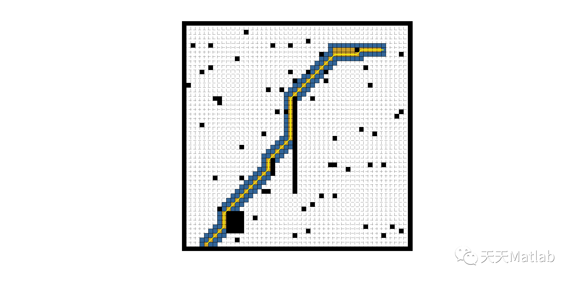 clear;clc;close alldisp('A*开始搜索路径......')%% 画一个方形地图map.XYMAX=50; % 地图尺寸map.start=[5,1]; % 起点坐标map.goal=[45,45]; % 终点坐标genGrid(map); % 绘制地图hold on;obstacle = GetBoundary(map); %边界数据nObstacle = 60; %在地图中随机加入XX个障碍物obstacle = GetObstacle(nObstacle,obstacle,map);%障碍物和边界坐标obstacle = [obstacle;10 4;10 5;10 6;10 7;10 8];obstacle = [obstacle;11 4;11 5;11 6;11 7;11 8];obstacle = [obstacle;12 4;12 5;12 6;12 7;12 8];obstacle = [obstacle;13 4;13 5;13 6;13 7;13 8];obstacle = [obstacle;20 20;20 19;20 18;20 17;];obstacle = [obstacle;25 20;25 19;25 18;25 17;25 16;25 15;25 14;25 13;25 21;25 22;25 23;25 24;25 25;25 26;25 28;25 27];obstacle = [obstacle;25 29;25 30;25 31;25 32;25 33;25 34;25 38];%% 画出障碍点fillPlot(obstacle,[0 0 0]);%% 调用算法画出路径path=AStar(obstacle,map);%A*算法if length(path)>=1plot(path(:,1),path(:,2),'Color','y','LineWidth',2);end