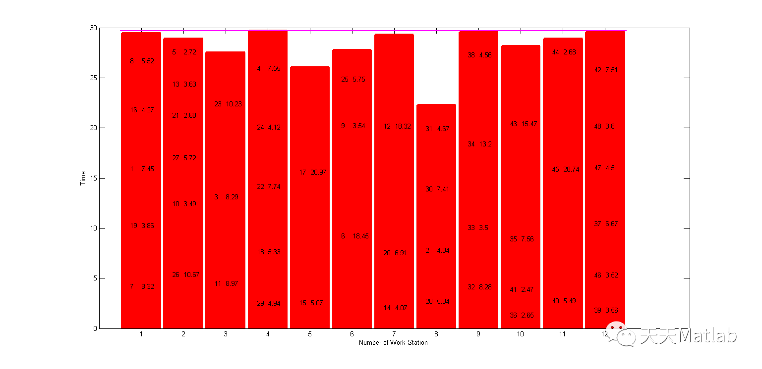 %%%%%%%%%%%%%%%%%%%%%%%%%%%%%%%%%%%%%%%%%%%%%%%%%%%%%%%%%%%%%%%%%%%%%% Function: Decoding.m% Description: 译码函数% Input: Population % 待译码种群% Time % 各工位所需时间% Num_Work % 装配线工位数% Output: dec_result % 译码结果% Return: None% Referred:None% Variable: RESULT % 加工顺序矩阵% RESULT_Time % 加工时间矩阵% SUM % 加工总时间% AVE % 平均加工时间% AVE1 % 最小工位节拍(理论)% WORKSPACE % 增量计算前工位安排% WORKSPACE1 % 增量计算后工位安排% c1 % 改进前结果% c2 % 改进后结果% Others: 利用潜在增量算法实现%%%%%%%%%%%%%%%%%%%%%%%%%%%%%%%%%%%%%%%%%%%%%%%%%%%%%%%%%%%%%%%%%%%%%function [dec_result]=Decoding(Population,Time,Num_Work)RESULT=Population;RESULT_Time=Time(RESULT); % 将加工顺序转换为加工时间[a,b]=size(RESULT_Time); %RESULT_Time是100行,66列的矩阵,a=100,b=66.SUM=sum(Time); % 所有工序总加工时间AVE=SUM/Num_Work; % 每个工位平均加工时间 ,理论生产节拍CT'AVE1=max(AVE,max(Time)); % 最小工位节拍(理论) .去每个工位最大的时间和工序最大时间的最大者,但是一般很少有单个作业单元的值大于工位平均加工时间的吧。所以这函数AVEfor k=1:1:aAVE1=max(AVE,max(Time));RESULT_Time1=[RESULT_Time(k,:) 0]; % 为了便于迭代,随着迭代,在RESULT_Time每一行的末尾补0c2=0;c1=SUM; %C1为工序加总时间% 利用潜在增量方法迭代while c2<c1 % 如果存在潜在增量则进行迭代j=1;WORKSPACE=zeros(1,b); %workspce为1行b,即1行66列的列。for i=1:1:b % 将加工单元分配到工作站if WORKSPACE(j)+RESULT_Time1(i)>AVE1 %RESULT_Time1(i)没有问题,因为RESULT_Time(k,:) 0,就是一行行得c3(j)=i; %这啥东西j=j+1;endWORKSPACE(j)=WORKSPACE(j)+RESULT_Time1(i);endWORKSPACE(Num_Work)=SUM-sum(WORKSPACE(1:Num_Work-1)); %最后一个工位的时间等于所有工位时间减去前几个工位总时间% 计算潜在增量 ,,这个要怎么理解??WORKSPACE1=WORKSPACE; %把workspce的工位及排序赋予workspacesi=1:1:Num_Work-1; %i等于 1到工位数 ,这里是不是要用一个for循环???WORKSPACE1(i)=WORKSPACE1(i)+RESULT_Time1(c3(i)); % 计算潜在增量,以一个作业的时间值作为增量c1=max(WORKSPACE(1:Num_Work)); % 改进前结果 ,workspace。。CTc2=min(WORKSPACE1(1:Num_Work-1)); % 改进后结果 ,workspace1。CT’AVE1=min(c1,c2); %取c1,c2二者中较小的那个数值,作为生产线节拍enddec_result(k,:)=WORKSPACE(1:Num_Work); % 译码结果 ,k=1时,的工位分布。k=2时的工位分布。。。直到k=100时的工位分布。endend