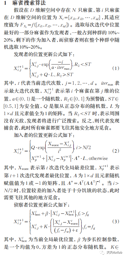 %_________________________________________________________________________%% 麻雀优化算法 %%_________________________________________________________________________%function [Best_pos,Best_score,curve]=SSA(pop,Max_iter,lb,ub,dim,fobj)ST = 0.6;%预警值PD = 0.7;%发现者的比列,剩下的是加入者SD = 0.2;%意识到有危险麻雀的比重PDNumber = round(pop*PD); %发现者数量SDNumber = round(pop*SD);%意识到有危险麻雀数量if(max(size(ub)) == 1)ub = ub.*ones(1,dim);lb = lb.*ones(1,dim);end%种群初始化X0=initialization(pop,dim,ub,lb);X = X0;%计算初始适应度值fitness = zeros(1,pop);for i = 1:popfitness(i) = fobj(X(i,:));end[fitness, index]= sort(fitness);%排序BestF = fitness(1);WorstF = fitness(end);GBestF = fitness(1);%全局最优适应度值for i = 1:popX(i,:) = X0(index(i),:);endcurve=zeros(1,Max_iter);GBestX = X(1,:);%全局最优位置X_new = X;for i = 1: Max_iterBestF = fitness(1);WorstF = fitness(end);R2 = rand(1);for j = 1:PDNumberif(R2<ST)X_new(j,:) = X(j,:).*exp(-j/(rand(1)*Max_iter));elseX_new(j,:) = X(j,:) + randn()*ones(1,dim);endendfor j = PDNumber+1:pop% if(j>(pop/2))if(j>(pop - PDNumber)/2 + PDNumber)X_new(j,:)= randn().*exp((X(end,:) - X(j,:))/j^2);else%产生-1,1的随机数A = ones(1,dim);for a = 1:dimif(rand()>0.5)A(a) = -1;endendAA = A'*inv(A*A');X_new(j,:)= X(1,:) + abs(X(j,:) - X(1,:)).*AA';endendTemp = randperm(pop);SDchooseIndex = Temp(1:SDNumber);for j = 1:SDNumberif(fitness(SDchooseIndex(j))>BestF)X_new(SDchooseIndex(j),:) = X(1,:) + randn().*abs(X(SDchooseIndex(j),:) - X(1,:));elseif(fitness(SDchooseIndex(j))== BestF)K = 2*rand() -1;X_new(SDchooseIndex(j),:) = X(SDchooseIndex(j),:) + K.*(abs( X(SDchooseIndex(j),:) - X(end,:))./(fitness(SDchooseIndex(j)) - fitness(end) + 10^-8));endend%边界控制for j = 1:popfor a = 1: dimif(X_new(j,a)>ub(a))X_new(j,a) =ub(a);endif(X_new(j,a)<lb(a))X_new(j,a) =lb(a);endendend%更新位置for j=1:popfitness_new(j) = fobj(X_new(j,:));endfor j = 1:popif(fitness_new(j) < GBestF)GBestF = fitness_new(j);GBestX = X_new(j,:);endendX = X_new;fitness = fitness_new;%排序更新[fitness, index]= sort(fitness);%排序BestF = fitness(1);WorstF = fitness(end);for j = 1:popX(j,:) = X(index(j),:);endcurve(i) = GBestF;endBest_pos =GBestX;Best_score = curve(end);end