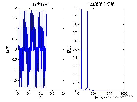 %%%%%%%%%%%%%%%%%%%%%%%%%%%%%%设定初始参数%%%%%%%%%%%%%%%%%%%%%%%%%%%%%%%%%fs=2048; %采样频率N=512; %采样点数n=0:N-1;t=n/fs; %时间f1=100;f2=300; %低频f3=800; %高频s=cos(2*pi*f1*t)+cos(2*pi*f2*t)+cos(2*pi*f3*t);%假定信号subplot(121);plot(t,s);title('输入信号');xlabel('t/s');ylabel('幅度');%未滤波时 时域波形sfft=fft(s); %傅里叶变换subplot(122);plot((1:length(sfft)/2)*fs/length(sfft),2*abs(sfft(1:length(sfft)/2))/length(sfft));title('信号频谱');xlabel('频率/Hz');ylabel('幅度'); %未滤波时 频域波形%%%%%%%%%%%%%%%%%%%%%%%%%%%%%%设计巴特沃斯低通滤波器%%%%%%%%%%%%%%%%%%%%%%%%Wp=900/fs;Ws=1000/fs;[n,Wn]=buttord(Wp,Ws,1,50); %阻带衰减大于50db,通带纹波小于1db%估算得到Butterworth低通滤波器的最小阶数N和3dB截止频率Wn[a,b]=butter(n,Wn);[h,f]=freqz(a,b,'whole',fs); %求数字低通滤波器的频率响应f=(0:length(f)-1)*fs/length(f); %进行对应的频率转换figure(2);plot(f(1:length(f)/2),abs(h(1:length(f)/2))); %绘制巴特沃斯幅频响应图title('巴特沃斯低通滤波器');xlabel('频率/Hz');ylabel('幅度');grid;sF=filter(a,b,s); %叠加函数s经过低通滤波器以后的新函数figure(3);subplot(121);plot(t,sF); %绘制叠加函数s经过低通后时域图形title('输出信号');xlabel('t/s');ylabel('幅度');SF=fft(sF);subplot(122);plot((1:length(SF)/2)*fs/length(SF),2*abs(SF(1:length(SF)/2))/length(SF));title('低通滤波后频谱');xlabel('频率/Hz');ylabel('幅度');%%%%%%%%%%%%%%%%%%%%%%%%%%%%%%时域特征值计算%%%%%%%%%%%%%%%%%%%%%%%%%%%%%%%%iemg1=sum(abs(sF))/length(sF);rms1=sqrt(sum(sF.^2)/length(sF));%%%%%%%%%%%%%%%%%%%%%%%%%%%%%%频域特征值计算%%%%%%%%%%%%%%%%%%%%%%%%%%%%%%%%L1=length(sF);cx1=xcorr(sF,'unbiased');cxk1=fft(cx1,L1);px1=abs(cxk1); %求功率谱密度pxx1=10*log10(px1);figure(4)f1=(0:L1-1)*fs/L1;plot(f1(1:L1/2),pxx1(1:L1/2))figure(4)xlabel('频率/Hz');ylabel('功率谱/dB');title('平均功率谱图');grid on %做功率谱图df1=fs/L1;p1=(sum(px1(1:L1/2-1))+sum(px1(1:L1/2)))/2.*df1;pf1=(sum(px1(1:L1/2-1).*[1:L1/2-1].*df1)+sum(px1(1:L1/2).*[1:L1/2].*df1))/2*df1;MPF1=pf1/p1 ; %求平均功率频率N1=1;pp1=0;while abs(pp1-p1/2)>(px1(N1)+px1(N1+1))/2*df1pp1=pp1+(px1(N1)+px1(N1+1))/2*df1;N1=N1+1;endn_1=(N1+N1+1)/2;MF1=df1*n_1; %求中值频率MF=MF1MPF=MPF1iemg=iemg1rms=rms1
