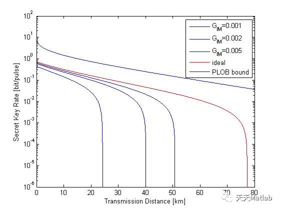 % the calculations from NEW%asymmetric case with immLac=0:0.0001:100; %distance between Alice and Bobfor G=[0.001,0.002,0.005]VM=6;VA=VM+1;VB=VM+1;V=VA;a=0.2;%the loss of fiber is 0.2dB/kmvel=0;eta=1;Lbc=0;yitaA=power(10,-a.*Lac/10); %channel losses in channel ACyitaB=power(10,-a.*Lbc/10); %channel losses in channel BCg=sqrt(2*(VB-1)./(yitaB.*eta.*(VB+1)));T=yitaA./2.*g.*g;eA=0.002;eB=0.002; %the excess noise of channel AC and BCeAIM=G*VM;eBIM=G*VM;XA=(1-yitaA)./yitaA+eA;XB=(1-yitaB)./yitaB+eB;Xhom=(vel+1-eta)/eta;%the noise introduced by Charlie's homdyne detectionseIM=eAIM+(1./yitaA).*(yitaB.*(eBIM-2)+2);etot=eA+(1./yitaA).*(yitaB.*(eB-2)+2+2*Xhom)+eIM; %the equivalent total excess noiseXline=1./T-1+etot;Xtot=Xline;beta=0.96; %reverse reconciliationa=V;b=T.*(V+Xtot);c=sqrt(T.*(V^2-1));IAB=log2((a+1)./(a+1-power(c,2)./(b+1)));% IAB=log2((T.*(V+Xtot)+1)./(T.*(1+Xtot)+1));IABfinal=beta*IAB;A=power(a,2)+power(b,2)-2*power(c,2);B=a.*b-power(c,2);lamd1=sqrt(0.5)*sqrt(A+sqrt(A.*A-4*power(B,2)));lamd2=sqrt(0.5)*sqrt(A-sqrt(A.*A-4*power(B,2)));%lamd3=sqrt(a-power(c,2)./(b+1));lamd3=a-power(c,2)./(b+1);XBE=((lamd1)/2+0.5).*log2((lamd1)/2+0.5)-((lamd1)/2-0.5).*log2((lamd1)/2-0.5)+((lamd2)/2+0.5).*log2((lamd2)/2+0.5)-((lamd2)/2-0.5).*log2((lamd2)/2-0.5)-(((lamd3)/2+0.5).*log2((lamd3)/2+0.5)-((lamd3)/2-0.5).*log2((lamd3)/2-0.5));K=IABfinal-XBE;semilogy(Lac,K);axis([0 50 10^(-6) 10^2])hold on;end%%%perfect asymmetric caseVM=6;VA=VM+1;VB=VM+1;V=VB;a=0.2;%the loss of fiber is 0.2dB/kmvel=0;eta=1;Lac=0:0.0001:100; %distance between Alice and BobLbc=0;yitaA=power(10,-a.*Lac/10); %channel losses in channel ACyitaB=power(10,-a.*Lbc/10); %channel losses in channel BCg=sqrt(2*(VB-1)./(yitaB.*eta.*(VB+1)));T=yitaA./2.*g.*g;eA=0.002;eB=0.002; %the excess noise of channel AC and BCXA=(1-yitaA)./yitaA+eA;XB=(1-yitaB)./yitaB+eB;Xhom=(vel+1-eta)/eta;%the noise introduced by Charlie's homdyne detectionsetot=eA+(1./yitaA).*(yitaB.*(eB-2)+2+2*Xhom); %the equivalent total excess noiseXline=1./T-1+etot;Xtot=Xline;beta=0.96; %reverse reconciliationa=V;b=T.*(V+Xtot);c=sqrt(T.*(V^2-1));IAB=log2((a+1)./(a+1-power(c,2)./(b+1)));% IAB=log2((T.*(V+Xtot)+1)./(T.*(1+Xtot)+1));IABfinal=beta*IAB;A=power(a,2)+power(b,2)-2*power(c,2);B=a.*b-power(c,2);lamd1=sqrt(0.5)*sqrt(A+sqrt(A.*A-4*power(B,2)));lamd2=sqrt(0.5)*sqrt(A-sqrt(A.*A-4*power(B,2)));%lamd3=sqrt(a-power(c,2)./(b+1));lamd3=a-power(c,2)./(b+1);XBE=((lamd1)/2+0.5).*log2((lamd1)/2+0.5)-((lamd1)/2-0.5).*log2((lamd1)/2-0.5)+((lamd2)/2+0.5).*log2((lamd2)/2+0.5)-((lamd2)/2-0.5).*log2((lamd2)/2-0.5)-(((lamd3)/2+0.5).*log2((lamd3)/2+0.5)-((lamd3)/2-0.5).*log2((lamd3)/2-0.5));K=IABfinal-XBE;semilogy(Lac,K,'r');axis([0 80 10^(-6) 10^2])hold on;t=0:0.00001:1;L=50*(-log10(t));k=-log2(1-t);semilogy(L,k);xlabel('Transmission Distance [km]');ylabel('Secret Key Rate [bit/pulse]');legend('G_{IM}=0.001','G_{IM}=0.002','G_{IM}=0.005','ideal','PLOB bound')