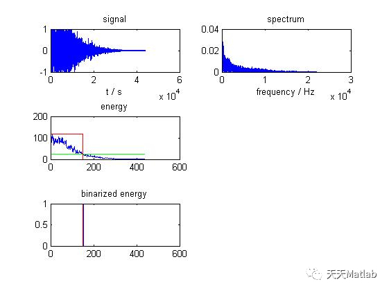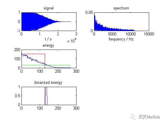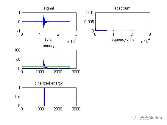 for i = 1:6% file_name = strcat('dataset_horn',num2str(i));% file_name = strcat(file_name,'.wav');% fprintf('reading %s...\n',file_name);% [y,fs] = audioread(file_name);% sz = size(y);% if sz(2) > 1% gun = ((y(:,1)+y(:,2))/2)'; % 多声道,只要一个% elseif sz(1) == 1% gun = (y(:,1))'; % 单声道% endgun = data_gun(1,:);%figure(i);figure(1);p2 = abs(fft(gun)/length(gun));gun_fft = p2(1:length(gun)/2+1);gun_fft(2:end-1) = 2*gun_fft(2:end-1);f = fs*(0:(length(gun)/2))/length(gun);%subplot(1,2,1);plot(gun);xlabel('t / s');%subplot(1,2,2);subplot(3,2,i);plot(gun_fft);title('spectrum');xlabel('frequency / Hz');end