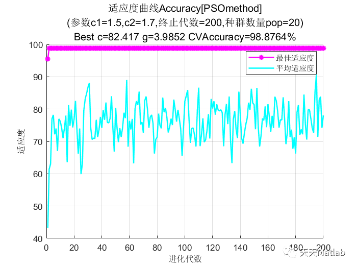 %% I. 清空环境clcclear%% II. 声明全局变量global datadata=xlsread('BreastCancer_data');%% III. 参数初始化c1 = 0.25;c2 = 0.25;maxgen = 16; % 进化次数sizepop = 4; %种群规模Vmax = 0.25;Vmin = -0.25;popmax = 1;popmin = 0;for m=1:9if zbest(m)>=0.5selection(n)=m;n=n+1;endenddisp(['基于粒子群算法的SVM特征选择的结果为:特征 ',num2str(selection)]);disp(['基于粒子群算法的SVM特征选择的分类准确率为:',num2str(fitnesszbest),'%']);figureplot(yy)title('最优个体适应度','fontsize',12);xlabel('进化代数','fontsize',12);ylabel('适应度','fontsize',12);