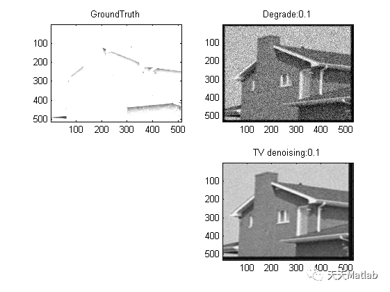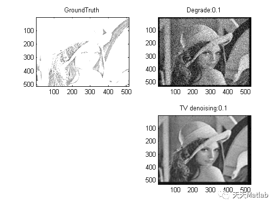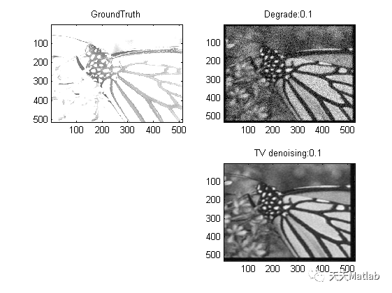%%%%梯度为0直接求解四种正则%%%%%%clear all;close all;x0 = double(imread('groundtruth\monarch.tif')); %导入groundtruthg0 = double(imread('degraded\monarch_n_0.1.tif')); %导入含噪图像g0k = fspecial('gaussian',19,2);%给定高斯模糊核lamda = 0.8; %正则化系数0.8[row column] = size(g0); %获取图像维度%图像二维傅里叶变换离散化K = fft2(k,row,column); %高斯核G = fft2(g0); %含噪图像%差分矩阵l1=[0 0 0;-1 1 0;0 0 0];l2=[0 -1 0;0 1 0;0 0 0];%傅里叶变换为频域530*530的矩阵Lx = fft2(l1,row,column);Ly = fft2(l2,row,column);%%%%%%%%%%使用二维傅里叶变换和梯度为零直接求解四种正则%%%%%%%%%%%L1正则:%x_iteration = ifft2((K'.*G-lamda)./(K'.*K));%L2正则:%x_iteration = ifft2(((K'.*G)./(K'.*K+2*lamda));%TV正则:%x_iteration = ifft2((K'.*G-lamda*Lx'-lamba*Ly')./(K'.*K));%TV-L2正则:x_iteration = ifft2((K'.*G)./(K'.*K-2*lamda*(Lx.^2)-2*lamda*(Ly.^2)));%%%%%%%%%%%显示重建图片%%%%%%%%%%%%%%%%%%%%%%%%%%%%%%%%%%%%%%figure;colormap gray; %灰度化subplot(221);image(x0);title('GroundTruth');subplot(222);imagesc(g0);title('Degrade:0.1');subplot(224);imagesc(x_iteration);title('TV denoising:0.1');%%%%%%%%%%%%指标计算%%%%%%%%%%%%%%%%%%%%%%%%%%%%%%%%%%%%%%%%%[aa,bb] = size(x0);d_p = 9; %避免边界效应影响评估,去掉重建出来外面的一圈img1 = x_iteration(d_p:aa-d_p+1,d_p:bb-d_p+1); %重建图片img2 = x0(d_p:aa-d_p+1,d_p:bb-d_p+1); %groundtruthpsnr_result = psnr(img1,img2)[mssim, ~] = ssim_index(img1,img2)