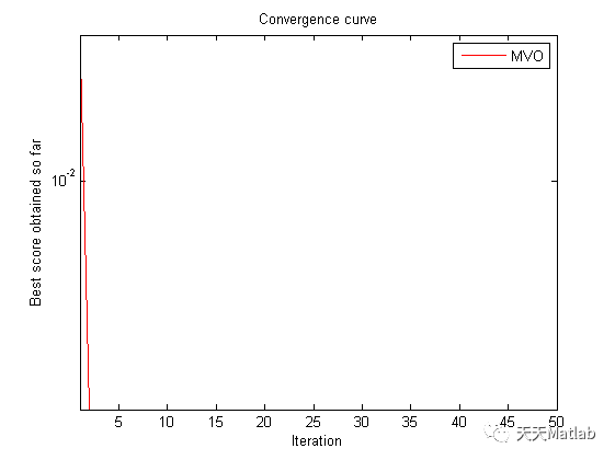 % Main paper: %% %% S. Mirjalili, S. M. Mirjalili, A. Hatamlou %%%_______________________________________________________________________________________%% You can simply define your cost in a seperate file and load its handle to fobj% The initial parameters that you need are:%__________________________________________% fobj = @YourCostFunction% dim = number of your variables% Max_iteration = maximum number of generations% SearchAgents_no = number of search agents% lb=[lb1,lb2,...,lbn] where lbn is the lower bound of variable n% ub=[ub1,ub2,...,ubn] where ubn is the upper bound of variable n% If all the variables have equal lower bound you can just% define lb and ub as two single number numbers% To run MVO: [Best_score,Best_pos,cg_curve]=MVO(Universes_no,Max_iteration,lb,ub,dim,fobj)%__________________________________________close all;clear;clc;tic;t = 0:2999;x = 3*(mod(t,100)==0) + randn(size(t)); % 输入仿真信号Universes_no=30; %Number of search agents (universes)Max_iteration=50; % 最大迭代次数% 待优化参数(宇宙)的上、下界和维度:%定义优化参数的取值范围:L取[100,300],M取[1,5]lb=[100,1];ub=[200,5];dim=2;[Best_score,Best_pos,cg_curve]=MVO(Universes_no,Max_iteration,lb,ub,dim,x);% 经过MVO优化后的两个参数bestL=Best_pos(1,1);bestM=Best_pos(1,2);%Draw the convergence curvefigure;semilogy(cg_curve,'Color','r')xlabel('Iteration');ylabel('Best score obtained so far');legend('MVO');title('Convergence curve');axis tightgrid offbox ondisplay(['The best solution obtained by MVO is : ', num2str(Best_pos)]);display(['The best optimal value of the objective funciton found by MVO is : ', num2str(Best_score)]);toc;