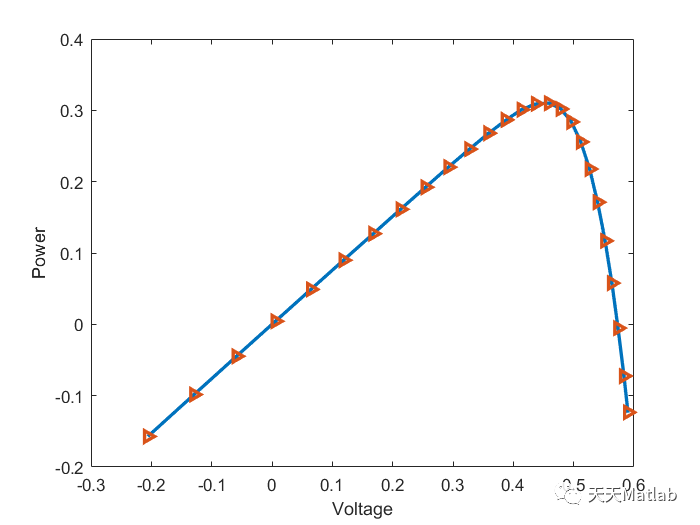 plot(V,V.*Ie,'>','LineWidth',2)