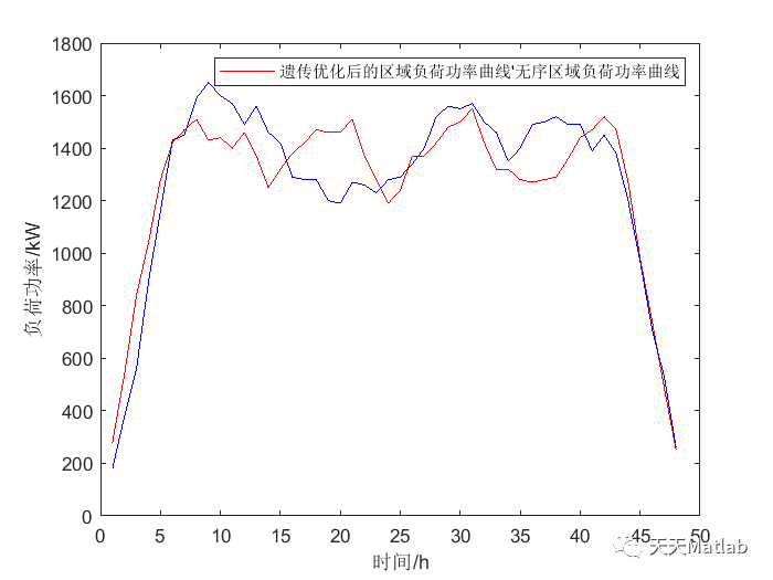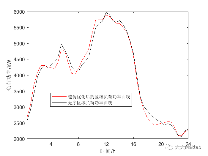 legend('遗传优化后的区域负荷功率曲线''无序区域负荷功率曲线')
