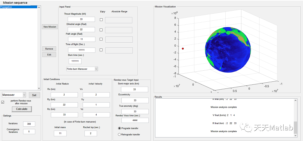 文章介绍了Matlab在航天器管控技术中的重要性,特别是对于任务规划这一关键环节。通过提供的代码示例,展示了如何进行轨道计算,包括能量计算、偏心率、周期和飞行路径角等参数的求解。此外,文章还提及了相关领域的技术,如智能优化算法和神经网络预测等。