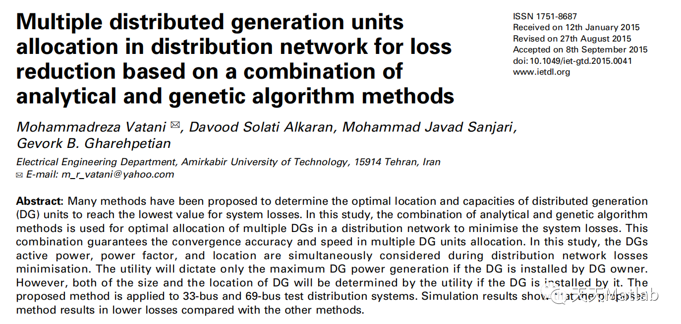 Vatani, M., Alkaran, D. S., Sanjari, M. J., & Gharehpetian, G. B. (2016). Multiple distributed generation units allocation in the distribution network for loss reduction based on a combination of analytical and genetic algorithm methods. IET Generation, Transmission & Distribution, 10(1), 66-72.