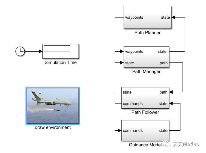 为了对小型无人机全过程飞行仿真进行研究,根据无人机飞行控制回路和制导回路,搭建了模块化的系统仿真结构,将Matlab/Simulink和Stateflow有机结合起来,建立了易于维护和扩展的仿真环境.利用仿真环境对无人机的控制规律和制导规律进行了仿真,结果表明了控制规律和制导规律的合理性,以及全过程仿真环境的实用性.