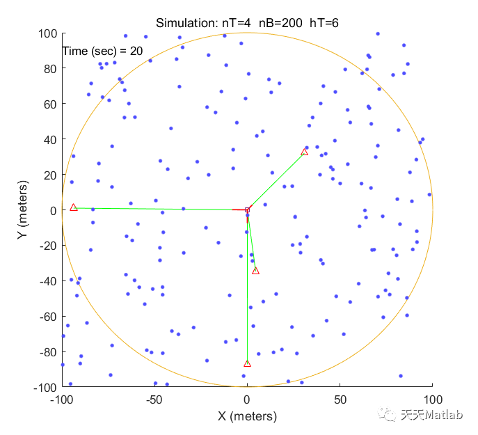 function test_Animate(s_mobility,s_input,time_step)v_t = 0:time_step:s_input.SIMULATION_TIME;for nodeIndex = 1:s_mobility.NB_NODES%Simple interpolation (linear) to get the position, anytime.%Remember that "interp1" is the matlab function to use in order to%get nodes' position at any continuous time.vs_node(nodeIndex).v_x = interp1(s_mobility.VS_NODE(nodeIndex).V_TIME,s_mobility.VS_NODE(nodeIndex).V_POSITION_X,v_t);vs_node(nodeIndex).v_y = interp1(s_mobility.VS_NODE(nodeIndex).V_TIME,s_mobility.VS_NODE(nodeIndex).V_POSITION_Y,v_t);end%%%%%%%%%%%%%%%%%%%%%%%%%%%%%%%%%%%%%%%%%%%%%%%%%%%%%%%%%%%%figure;hold on;%Ish add the BSs and linkshb = 1.8;hr = 1.4;ht = 6;R=100;frac = (hb-hr)/(ht-hr);lamT = 2e-4; %%%!!!!!!!!!!change here!!!!!!!!!!!!!!!nB = s_input.NB_NODES;nT = poissrnd(lamT*pi*R^2);rT = R*sqrt(rand(nT,1)); %location of APsalphaT = 2*pi*rand(nT,1);%location of APsxT = rT.*cos(alphaT);%location of APsyT = rT.*sin(alphaT);%location of APsxTfrac = frac*xT; %blockage zone around UE for each APsyTfrac = frac*yT;scatter(xT,yT,30,'r^')plot([zeros(length(xT),1),xT]',[zeros(length(yT),1),yT]','g')plot([zeros(length(xTfrac),1),xTfrac]',[zeros(length(yTfrac),1),yTfrac]',...'r','linewidth',1)th=0:0.01:2*pi; xx = R*cos(th); yy = R*sin(th);plot(xx,yy)scatter(0,0,20,'s')for nodeIndex = 1:s_mobility.NB_NODESvh_node_pos(nodeIndex) = plot(vs_node(nodeIndex).v_x(1),...vs_node(nodeIndex).v_y(1),'.','color',[0.3 0.3 1],...'MarkerSize',10);endtitle(cat(2,'Simulation time (sec): ',num2str(s_mobility.SIMULATION_TIME)));xlabel('X (meters)');ylabel('Y (meters)');xlim([-100,100])ylim([-100,100])name=strcat('Simulation: nT=',num2str(nT),' nB=',...num2str(nB), ' hT=',num2str(ht));title(name);ht = text(-100,90,cat(2,'Time (sec) = 0'));% ht = text(min(vs_node(1).v_x),max(vs_node(1).v_y),cat(2,'Time (sec) = 0'));% axis([min(vs_node(1).v_x) max(vs_node(1).v_x) min(vs_node(1).v_y) max(vs_node(1).v_y)]);hold off;%!!!!!!!!!!!!!!!!!!!!!!!!!!!!!!!change file name%!!!!!!!!!!!!!!!!!!!!!!!!!!!!!!!!!!!!!!!!!!!!!!%!!!!!!!!!!!!!!!!!!!!!!!!!!!!!!!!!!!!!!!!!!!!v = VideoWriter('simulation1','MPEG-4');%!!!!!!!!!!!!!!!!!!!!!!!!!!!!!!!!!!!!!!!!!!!!!!v.FrameRate=10;% v.CompressionRatio = 3;for timeIndex = 1:length(v_t);t = v_t(timeIndex);set(ht,'String',cat(2,'Time (sec) = ',num2str(t,4)));for nodeIndex = 1:s_mobility.NB_NODESset(vh_node_pos(nodeIndex),'XData',vs_node(nodeIndex).v_x(timeIndex),'YData',vs_node(nodeIndex).v_y(timeIndex));endset(gcf,'paperunits','inches')set(gcf,'position',[0 0 550 500])drawnow;%Ish save the movieax = gca;ax.Units = 'pixels';pos = ax.Position;ti = ax.TightInset;rect = [-ti(1), -ti(2), pos(3)+ti(1)+ti(3), pos(4)+ti(2)+ti(4)];F(timeIndex) = getframe(ax,rect);endopen(v)writeVideo(v,F);close(v)end