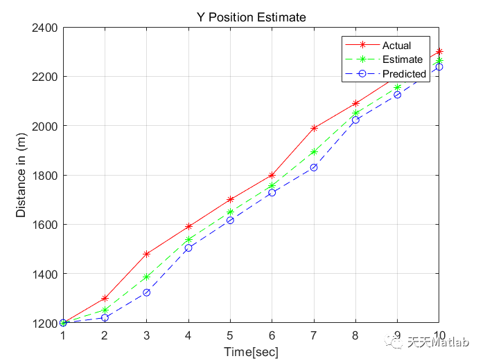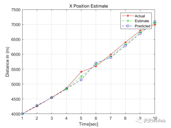 clc; close all;%initial statexo=25;vox=2;%Observations ****% X-Direction Calculation:X=[4000 4260 4550 4860 5410 5600 5990 6400 6790 7000 ]; %position-XV=[ 280 282 285 286 290 292 294 296 299 302]; % Velocity in 'X' direction%X = xlsread('DroneFlightTrace1.xlsx','R2:R700');%V = 0.07 .*[X];%Process Errors in Process Covaiance Matrixdel_px=20; %initial covariance matrix is choosen intuitivelydel_pv=5;%initial conditionsacc_x=2;del_t=1;vx=2;del_x=25; %uncertainity in the measurement%Observation Errordel_X=25;del_VX=6;Xk=[];%The Predicted StateA=[1 del_t;0 1];