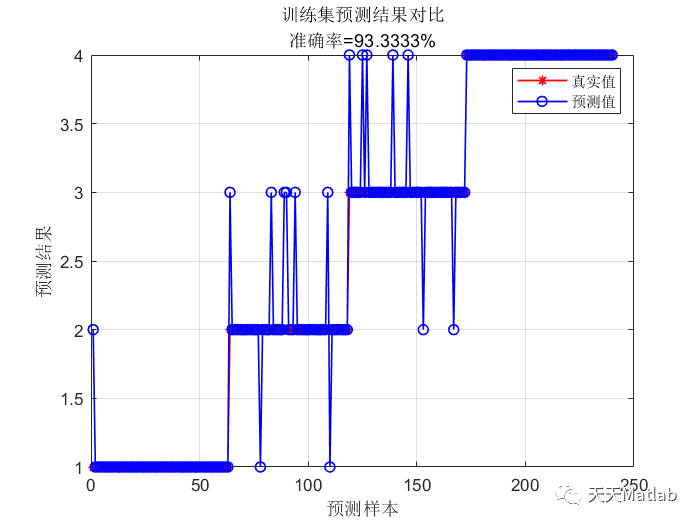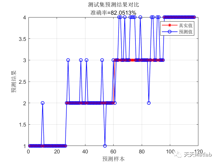 %% 清空环境变量warning off % 关闭报警信息close all % 关闭开启的图窗clear % 清空变量clc % 清空命令行%% 导入数据res = xlsread('数据集.xlsx');%% 划分训练集和测试集temp = randperm(357);P_train = res(temp(1: 240), 1: 12)';T_train = res(temp(1: 240), 13)';M = size(P_train, 2);P_test = res(temp(241: end), 1: 12)';T_test = res(temp(241: end), 13)';N = size(P_test, 2);%% 数据归一化[p_train, ps_input] = mapminmax(P_train, 0, 1);p_test = mapminmax('apply', P_test, ps_input );t_train = T_train;t_test = T_test ;%% 转置以适应模型p_train = p_train'; p_test = p_test';t_train = t_train'; t_test = t_test';%% 创建模型c = 10.0; % 惩罚因子g = 0.01; % 径向基函数参数cmd = ['-t 2', '-c', num2str(c), '-g', num2str(g)];model = svmtrain(t_train, p_train, cmd);%% 仿真测试T_sim1 = svmpredict(t_train, p_train, model);T_sim2 = svmpredict(t_test , p_test , model);%% 性能评价error1 = sum((T_sim1' == T_train)) / M * 100;error2 = sum((T_sim2' == T_test )) / N * 100;%% 数据排序[T_train, index_1] = sort(T_train);[T_test , index_2] = sort(T_test );T_sim1 = T_sim1(index_1);T_sim2 = T_sim2(index_2);%% 绘图figureplot(1: M, T_train, 'r-*', 1: M, T_sim1, 'b-o', 'LineWidth', 1)legend('真实值', '预测值')xlabel('预测样本')ylabel('预测结果')string = {'训练集预测结果对比'; ['准确率=' num2str(error1) '%']};title(string)gridfigureplot(1: N, T_test, 'r-*', 1: N, T_sim2, 'b-o', 'LineWidth', 1)legend('真实值', '预测值')xlabel('预测样本')ylabel('预测结果')string = {'测试集预测结果对比'; ['准确率=' num2str(error2) '%']};title(string)grid%% 混淆矩阵figurecm = confusionchart(T_train, T_sim1);cm.Title = 'Confusion Matrix for Train Data';cm.ColumnSummary = 'column-normalized';cm.RowSummary = 'row-normalized';figurecm = confusionchart(T_test, T_sim2);cm.Title = 'Confusion Matrix for Test Data';cm.ColumnSummary = 'column-normalized';cm.RowSummary = 'row-normalized';