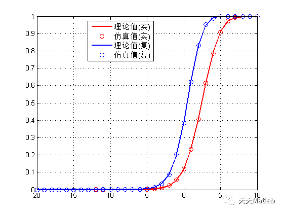 % 已知参数的随机性信号检测 (能量检测器)% 经典的假设检验问题,通常假设实信号:% H0:只有高斯白噪声,均值为0,方差σw^2% H1:高斯随机信号+白噪声,均值为0,方差σs^2+σw^2% 这时候用似然比准则可以得到检测器为能量检测器% 但是阈值不知道。本程序中给出了检测阈值。% 另外,对于复信号理论上并没有给出推导,虽然也是能量% 检测器,但是实际上和实信号还是有一定的区别的,% 尤其在阈值上。本程序也给出了复信号的检测阈值,% 并给出了较为简洁的分析方法。% 在理论分析的基础上,利用蒙特卡洛仿真验证了结果。% 给出的PDF文件中,有从书上截图,可以对比结果。clear all; close all; clc;N=25; % 信号长度Pfa=1e-5; % 虚警概率p = 1-Pfa; % 卡方分布的累积概率密度为1-Pfa% 注意:实数据和复数据的门限是不一样的% 原因在于,实数据是N个x^2相加,每个x~N(0,σw^2)% Tx=sum(x^2),那么Tx/σw^2就服从于N自由度的卡方分布% 而复数据,虽然也是N个数据的平方和相加,但如果把实部和虚部拆开来看% 就变成了2N个数据的平方和相加,每个数据x~N(0,σw^2/2),% Tx=sum(x^2),那么Tx/(σw^2/2)就服从于2N自由度的卡方分布% 所以应该按照下面的两个公式分别求解实数和复数的检测门限sigma_w=1; % 高斯白噪声的标准差 σwthres_shi_theory = chi2inv(p,N)*sigma_w^2; %根据逆卡方分布的累积函数,求解实序列的检测阈值thres_com_theory = chi2inv(p,2*N)*sigma_w^2/2; %根据逆卡方分布的累积函数,求解复序列的检测阈值SNR_dB=-20:10; % 信噪比 σs^2/σw^2,单位dBSNR_len=length(SNR_dB);SNR=10.^(SNR_dB/10); % σs^2sigma_s=SNR.^0.5; % 标准差σssigma_all=sqrt(sigma_s.^2+sigma_w.^2); % H1假设下的标准差,因为总方差是σs^2+σw^2Mont_num=10000; % 蒙特卡洛仿真次数for ii=1:SNR_lensigma_s=SNR(ii)^0.5; % 信号分量的标准差σsnum_detect_shi=0; % 实信号检测时的计数器,初始化num_detect_complex=0;for jj=1:Mont_num%% 复信号x_real=sigma_all(ii)/(2^0.5)*randn(1,N); % 复信号的实部x_imag=sigma_all(ii)/(2^0.5)*randn(1,N); % 复信号的虚部x_complex=x_real+1i*x_imag; % 复信号Tx_complex=x_complex*x_complex'; % 计算出来的Txif Tx_complex>thres_com_theory % 复信号检测num_detect_shi=num_detect_shi+1; % 计数器加1end%% 实信号x_shi=sigma_all(ii)*randn(1,N); % 实信号Tx_shi=x_shi*x_shi'; % 计算出来的Txif Tx_shi>thres_shi_theorynum_detect_complex=num_detect_complex+1;endenddetect_rate_complex(ii)=num_detect_shi/Mont_num; % 复信号仿真的检测概率detect_rate_shi(ii)=num_detect_complex/Mont_num; % 实信号仿真的检测概率endPD_complex= 1-chi2cdf(2*thres_com_theory/sigma_w.^2./(SNR+1),2*N); %复信号的理论检测概率PD_shi= 1-chi2cdf(thres_shi_theory/sigma_w.^2./(SNR+1),N); %实信号的理论检测概率figureplot(SNR_dB,PD_shi,'r-','Linewidth',2); hold on;plot(SNR_dB,detect_rate_shi,'ro');hold on;plot(SNR_dB,PD_complex,'b-','Linewidth',2); hold on;plot(SNR_dB,detect_rate_complex,'bo');grid on;legend('理论值(实)','仿真值(实)','理论值(复)','仿真值(复)')axis([SNR_dB(1) SNR_dB(end) 0 1]);