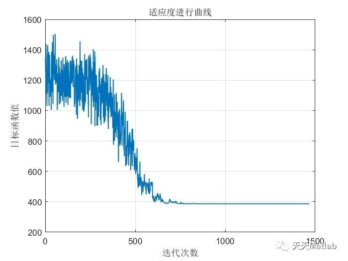 clc,clear,close all;%% ------------------------------------------------------------------------%加载数据load data_all.matdata = zeros(25,2);data(:,1) = data_all(:,2);data(:,2) = data_all(:,3);%% ------------------------------------------------------------------------%模拟退火参数设置n = size(data,1); %站点数量T = 100*n; %初始温度L = 100; %马尔可夫链长度K = 0.99; %衰减参数%% ------------------------------------------------------------------------%站点坐标结构体cp = struct([]);for i = 1:ncp(i).x = data(i,1);cp(i).y = data(i,2);endendfigure(2);plot(len, 'LineWidth', 1.1)grid on;xlabel('迭代次数')ylabel('目标函数值')title('适应度进行曲线')disp('优化结束')%% ------------------------------------------------------------------------%计算路线总长度函数function len = funcp(cp,n)len = 0;for i = 1:n-1len = len+sqrt((cp(i).x-cp(i+1).x)^2+(cp(i).y-cp(i+1).y)^2); %累计欧氏距离endlen = len+sqrt((cp(n).x-cp(1).x)^2+(cp(n).y-cp(1).y)^2);end
