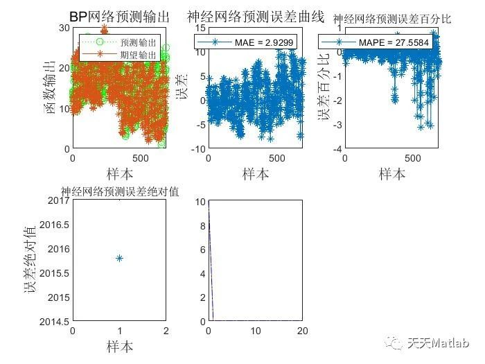 本次训练效果比较上次仿真较为准确,判定系数可以达到0.8左右(越靠近1表明仿真效果越好),预测值与实际值点状图基本围绕在主对角线左右,MSE平方误差可以达到0.01,BP网络预测输出图也可以看出预测值的变化趋势基本与期望值一致。