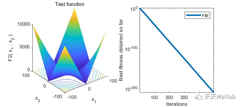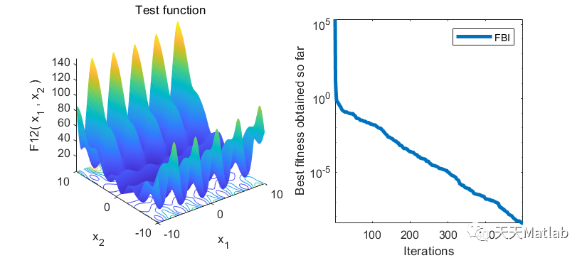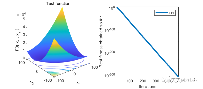 %_____________________________________________________________________________________________________clearvarsclose allclcdisp('FBI is tracking the problem');N=30; % Number of slime mouldFunction_name='F12'; % Name of the test function that can be from F1 to F23MaxIT=500; % Maximum number of iterations[lb,ub,dim,fobj]=Get_Functions_details(Function_name); % Function detailsTimes=1; %Number of independent times you want to run the FBIdisplay(['Number of independent runs: ', num2str(Times)]);for i=1:Times[Destination_fitness(i),bestPositions(i,:),Convergence_curve(i,:)]=FBI(N,MaxIT,lb,ub,dim,fobj);display(['The optimal fitness of FBI is: ', num2str(Destination_fitness(i))]);end[bestfitness,index]=min(Destination_fitness);disp('--------Best Fitness, Average Fitness, Standard Deviation and Best Solution--------');display(['The best fitness of FBI is: ', num2str(bestfitness)]);display(['The average fitness of FBI is: ', num2str(mean(Destination_fitness))]);display(['The standard deviation fitness of FBI is: ', num2str(std(Destination_fitness))]);display(['The best location of FBI is: ', num2str(bestPositions(index,:))]);figure('Position',[284 214 660 290])%Draw search spacesubplot(1,2,1);func_plot(Function_name);title('Test function')xlabel('x_1');ylabel('x_2');zlabel([Function_name,'( x_1 , x_2 )'])grid off%Draw objective spacesubplot(1,2,2);semilogy(Convergence_curve(index,:),'LineWidth',3);xlabel('Iterations');ylabel('Best fitness obtained so far');legend('FBI');box on;axis tight;grid off;
