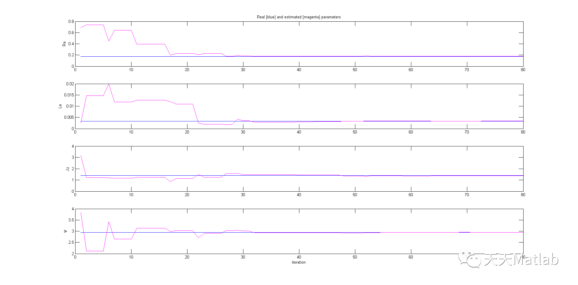 总之,粒子群优化是一种有效的方法,可以应用于直流电机参数估计问题。通过模拟鸟群觅食的行为,PSO算法可以搜索最优解,并估计电枢电阻、电枢电感、转动惯量、磁通和粘性阻尼系数等参数。这些参数估计结果可以用于优化直流电机的控制策略,提高其性能和效率。在未来的研究中,我们可以进一步探索PSO算法在电力系统中的应用,以提高电力系统的稳定性和可靠性。