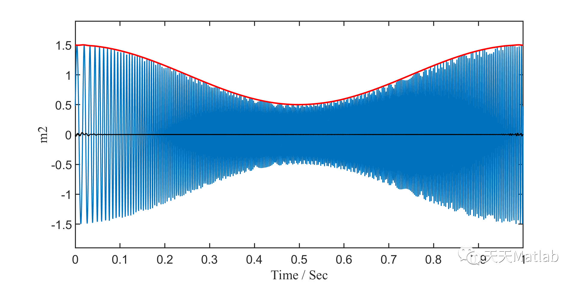 %%%%%%%%%%%%%% signal with intersecting IFs %%%%%%%%%%%%%%%%%clcclearclose allSampFreq = 2000;t = 0:1/SampFreq:1;Sig1 = (1+0.5*cos(2*pi*t)).*cos(2*pi*(0.2 + 532*t -474*t.^2 + 369*t.^3));IF1 = 532 - 948*t + 1107*t.^2;Sig2 = (1+0.5*cos(2*pi*t)).*cos(2*pi*(0.8+50*t + 525*t.^2 -300*t.^3));IF2 = 50 + 1050*t - 900*t.^2;Sig = Sig1+Sig2;figureset(gcf,'Position',[20 100 320 250]);set(gcf,'Color','w');plot(t,Sig,'linewidth',1);xlabel('Time / Sec','FontSize',12,'FontName','Times New Roman');ylabel('Amplitude','FontSize',12,'FontName','Times New Roman');set(gca,'xtick',[0 0.2 0.4 0.6 0.8 1]);set(gca,'FontSize',12)set(gca,'linewidth',1);axis([0 1 -4 4])%% STFTRatio = 0;figure[Spec,f] = STFT(Sig',SampFreq,512,256);imagesc(t,f,abs(Spec));axis([0 1 0 700]);set(gcf,'Position',[20 100 320 250]);xlabel('Time / Sec','FontSize',12,'FontName','Times New Roman');ylabel('Frequency / Hz','FontSize',12,'FontName','Times New Roman');set(gca,'xtick',[0 0.2 0.4 0.6 0.8 1]);set(gca,'YDir','normal')set(gca,'FontSize',12);set(gcf,'Color','w');%% parameter settinginiIF = [700*ones(1,length(t));20*ones(1,length(t))];% initial guess for the IFs for the three signal modesalpha = 5e-6;beta = 1e-6; % this parameter can be smaller which will be helpful for the convergence, but it may cannot properly track fast varying IFsvar = 0;% noise variancetol = 1e-8;%tic[IFmset IA smset] = VNCMD(Sig,SampFreq,iniIF,alpha,beta,var,tol);toc%% Relative errors of the finally estimated IFsRE1 = norm(IFmset(1,:,end)-IF1)/norm(IF1)RE2 = norm(IFmset(2,:,end)-IF2)/norm(IF2)%% estimated IFfigureplot(t,[IF1;IF2],'b','linewidth',3) % true IFshold onplot(t,IFmset(:,:,end),'r','linewidth',3) % finally estimated IFsset(gcf,'Position',[20 100 640 500]);xlabel('Time / Sec','FontSize',24,'FontName','Times New Roman');ylabel('Frequency / Hz','FontSize',24,'FontName','Times New Roman');set(gca,'xtick',[0 0.2 0.4 0.6 0.8 1]);set(gca,'YDir','normal')set(gca,'FontSize',24);set(gca,'linewidth',2);set(gcf,'Color','w');axis([0 1 0 800])%% Reconstructed modesfigureset(gcf,'Position',[20 100 640 200]);set(gcf,'Color','w');plot(t,smset(1,:,end),'linewidth',2) % estimated modehold onplot(t,Sig1 - smset(1,:,end),'k','linewidth',2) % estimation errorshold onplot(t,IA(1,:),'r','linewidth',3) % estimated IAsxlabel('Time / Sec','FontSize',24,'FontName','Times New Roman');ylabel('m1','FontSize',24,'FontName','Times New Roman');set(gca,'YDir','normal')set(gca,'FontSize',24);set(gca,'linewidth',2);axis([0 1 -1.9 1.9])figureset(gcf,'Position',[20 100 640 200]);set(gcf,'Color','w');plot(t,smset(2,:,end),'linewidth',2) % estimated modehold onplot(t,Sig2 - smset(2,:,end),'k','linewidth',2) % estimation errorshold onplot(t,IA(2,:),'r','linewidth',3) % estimated IAsxlabel('Time / Sec','FontSize',24,'FontName','Times New Roman');ylabel('m2','FontSize',24,'FontName','Times New Roman');set(gca,'YDir','normal')set(gca,'FontSize',24);set(gca,'linewidth',2);axis([0 1 -1.9 1.9])