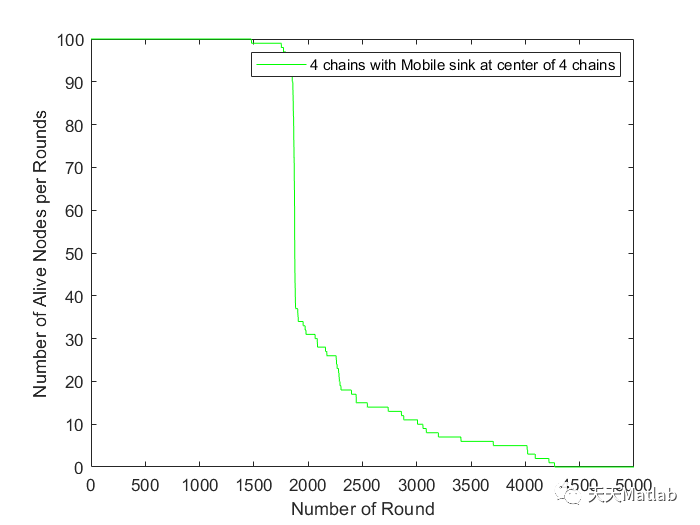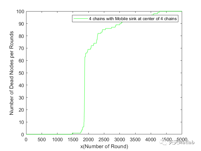 S3(i).xd=rand*50;S3(i).yd=50+rand*50;% plot(S3(i).xd,S3(i).yd,'m*')hold onS3(i).E=Eo;S3(i).Q=0;endif(i>50 && i<76)S3(i).xd=50+rand*50;S3(i).yd=50+rand*50;% plot(S3(i).xd,S3(i).yd,'r.')hold onS3(i).E=Eo;S3(i).Q=0;endif(i>75)S3(i).xd=50+rand*50;S3(i).yd=rand*50;hold on% plot(S3(i).xd,S3(i).yd,'b+')S3(i).E=Eo;S3(i).Q=0;end%%%%%%%endflag_first_dead1=0;flag_first_dead2=0;flag_first_dead3=0;flag_first_dead4=0;flag_all_dead1=0;flag_all_dead2=0;flag_all_dead3=0;flag_all_dead4=0;dead1=0;dead2=0;dead3=0;dead4=0;first_dead1=0;first_dead2=0;first_dead3=0;first_dead4=0;all_dead1=0;allive1=25;allive2=25;allive3=25;allive4=25;% % % counter for bit transmitted to Bases Stationpackets_TO_BS1=0;temp_L_node1=0;temp_L_node2=0;temp_L_node3=0;temp_L_node4=0;% figure(1);x=0;ym=50;% % this variable controle the speed of sink%%%%%%%%%%%%%%%%%%%%%for i=1:node_numberS3(i).parent=0;S3(i).children=zeros(1,100);endRENERGY1=zeros(1,rmax+1);for r3=0:rmax %r3for i=1:node_numberS3(i).parent=0;S3(i).children=zeros(1,100);endfor i=1:node_numberRENERGY1(r3+1) =RENERGY1(r3+1)+S3(i).E;endA1=zeros(25,25);%%%%%%%%%%%%%%%%%%%%%%%%%%%%%%%B1=zeros(50,50);%%%%%%%%%%%%%%%%%%%%%%%%%%%%%%%C1=zeros(75,75);%%%%%%%%%%%%%%%%%%%%%%%%%%%%%%%D1=zeros(100,100);%%%%%%%%%%%%%%%%%%%%%%%%%%%%%dead1=0;dead2=0;dead3=0;dead4=0;for i=1:1:25%flags for the calculation of first ,teenth, half and all nodes ..if (S3(i).E<=0)dead1=dead1+1;if (dead1==1)if(flag_first_dead1==0)first_dead1=r3+1;flag_first_dead1=1;endendif(dead1==25)if(flag_all_dead1==0)all_dead1=r3+1;flag_all_dead1=1;endendendendfor i=26:1:50%flags for the calculation of first ,teenth, half and all nodes ..if (S3(i).E<=0)dead2=dead2+1;if (dead2==1)if(flag_first_dead2==0)first_dead2=r3+1;flag_first_dead2=1;endendif(dead2==25)if(flag_all_dead2==0)all_dead2=r3+1;flag_all_dead2=1;endendendendfor i=51:1:75%flags for the calculation of first ,teenth, half and all nodes ..if (S3(i).E<=0)dead3=dead3+1;if (dead3==1)if(flag_first_dead3==0)first_dead3=r3+1;flag_first_dead3=1;endendif(dead3==25)if(flag_all_dead3==0)all_dead3=r3+1;flag_all_dead3=1;endendendendfor i=76:1:100%flags for the calculation of first ,teenth, half and all nodes ..if (S3(i).E<=0)dead4=dead4+1;if (dead4==1)if(flag_first_dead4==0)first_dead4=r3+1;flag_first_dead4=1;endendif(dead4==25)if(flag_all_dead4==0)all_dead4=r3+1;flag_all_dead4=1;endendendendSTATISTICS3(r3+1).ALLIVE1=allive1-dead1;STATISTICS3(r3+1).Et1=0;%total energy of nodes in a roundSTATISTICS3(r3+1).ALLIVE2=allive2-dead2;STATISTICS3(r3+1).Et2=0;%total energy of nodes in a roundSTATISTICS3(r3+1).ALLIVE3=allive3-dead3;STATISTICS3(r3+1).Et3=0;%total energy of nodes in a roundSTATISTICS3(r3+1).ALLIVE4=allive4-dead4;STATISTICS3(r3+1).Et4=0;%total energy of nodes in a roundSTATISTICS3(r3+1).DEAD5=dead1+dead2+dead3+dead4;STATISTICS3(r3+1).ALLIVE5=(STATISTICS3(r3+1).ALLIVE1+STATISTICS3(r3+1).ALLIVE2+STATISTICS3(r3+1).ALLIVE3+STATISTICS3(r3+1).ALLIVE4);for i=1:1:25if (S3(i).E>0)STATISTICS3(r3+1).Et1=STATISTICS3(r3+1).Et1 + S3(i).E;endendif (STATISTICS3(r3+1).ALLIVE1>0)STATISTICS3(r3+1).Eavg1=STATISTICS3(r3+1).Et1/(25*Eo);elseSTATISTICS3(r3+1).Eavg1=0;endfor i=26:1:50if (S3(i).E>0)STATISTICS3(r3+1).Et2=STATISTICS3(r3+1).Et2 + S3(i).E;endendif (STATISTICS3(r3+1).ALLIVE2>0)STATISTICS3(r3+1).Eavg2=STATISTICS3(r3+1).Et2/(25*Eo);elseSTATISTICS3(r3+1).Eavg2=0;endfor i=51:1:75if (S3(i).E>0)STATISTICS3(r3+1).Et3=STATISTICS3(r3+1).Et3 + S3(i).E;endendif (STATISTICS3(r3+1).ALLIVE3>0)STATISTICS3(r3+1).Eavg3=STATISTICS3(r3+1).Et3/(25*Eo);elseSTATISTICS3(r3+1).Eavg3=0;endfor i=76:1:100if (S3(i).E>0)STATISTICS3(r3+1).Et4=STATISTICS3(r3+1).Et4 + S3(i).E;endendif (STATISTICS3(r3+1).ALLIVE4>0)STATISTICS3(r3+1).Eavg4=STATISTICS3(r3+1).Et4/(25*Eo);elseSTATISTICS3(r3+1).Eavg4=0;endSTATISTICS3(r3+1).Eavg5=(STATISTICS3(r3+1).Eavg1+STATISTICS3(r3+1).Eavg2+STATISTICS3(r3+1).Eavg3+STATISTICS3(r3+1).Eavg4)/4;A=zeros(1,STATISTICS3(r3+1).ALLIVE1);for i=1:1:25if S3(i).E>0A(1)=i;break;endendfor i=2:STATISTICS3(r3+1).ALLIVE1for j=(A(i-1)+1):25,if S3(j).E>0A(i)=j;break;endendendB=zeros(1,STATISTICS3(r3+1).ALLIVE2);for i=26:1:50if S3(i).E>0B(1)=i;break;endendfor i=2:(STATISTICS3(r3+1).ALLIVE2)for j=(B(i-1)+1):50,if S3(j).E>0B(i)=j;break;endendendC=zeros(1,STATISTICS3(r3+1).ALLIVE3);for i=51:1:75if S3(i).E>0C(1)=i;break;endend