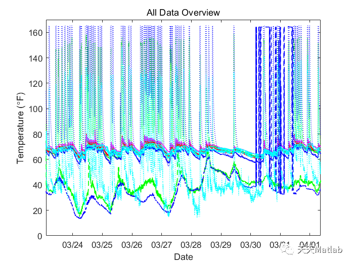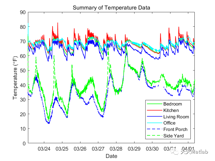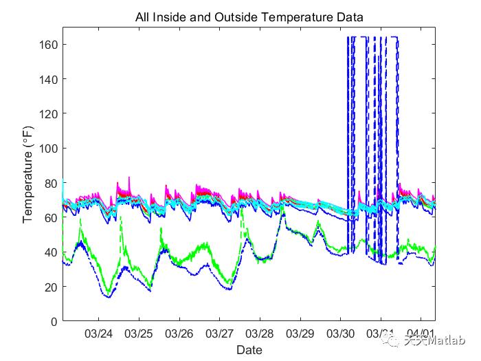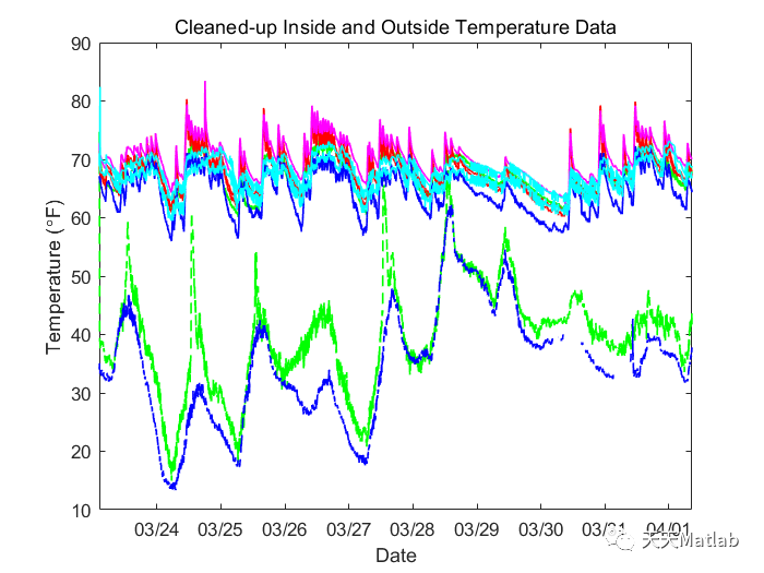 %% Introduction% In <part1_buildingthenetwork.html part one>, <part2_gatheringdata.html% part two>, and <part3_calibration.html part three> of this series of blog% post I went through the process of reading voltages from a network of% XBee(R) modules, building and testing my wireless network of temperature% sensors, calibrating the sensors, and gathering temperature data from the% network of sensors in my apartment. In this post I will show you some of% the basic analyses I performed on the data. In particular, I have two% goals:%% # determine how long it takes for my apartment to warm up after% the heat has been turned on, and% # find out what rooms in my apartment% take the longest to heat up, so I can make the necessary adjustments to% my radiators so that all the rooms warm up at the same rate.%% Overview of Data% As I mentioned in a previous post, I collected the temperature every two% minutes over the course of 9 days. I placed 14 sensors in my apartment: 9% located inside, 2 located outside, and 3 located in radiators. The data% is stored in the file <../twoweekstemplog.txt |twoweekstemplog.txt|>.[tempF,ts,location,lineSpecs] = XBeeReadLog('twoweekstemplog.txt',60);tempF = calibrateTemperatures(tempF);plotTemps(ts,tempF,location,lineSpecs)legend('off')xlabel('Date')title('All Data Overview')%%% _Figure 1: All temperature data from a 9 day period._%% That graph is a bit too cluttered to be very meaningful. Let me remove% the radiator data and the legend and see if that helps.notradiator = [1 2 3 5 6 7 8 9 10 12 13];plotTemps(ts,tempF(:,notradiator),location(notradiator),lineSpecs(notradiator,:))legend('off')xlabel('Date')title('All Inside and Outside Temperature Data')%%% _Figure 2: Just inside and outside temperature data, with radiator data removed._%% Now I can see some places where one of the outdoor temperature sensors% (blue line) gave erroneous data, so let's remove those data points. This% data was collected in March in Massachusetts, so I can safely assume the% outdoor temperature never reached 80 F. I replaced any values above 80 F% with |NaN| (not-a-number) so they are ignored in further analysis.outside = [3 10];outsideTemps = tempF(:,outside);toohot = outsideTemps>80;outsideTemps(toohot) = NaN;tempF(:,outside) = outsideTemps;plotTemps(ts,tempF(:,notradiator),location(notradiator),lineSpecs(notradiator,:))legend('off')xlabel('Date')title('Cleaned-up Inside and Outside Temperature Data')%%% _Figure 3: Inside and outside temperature data with erroneous data removed._%% I'll also remove all but one inside sensor per room, and give the% remaining sensors shorter names, to keep the graph from getting too% cluttered.show = [1 5 9 12 10 3];location(show) = ...{'Bedroom','Kitchen','Living Room','Office','Front Porch','Side Yard'}';plotTemps(ts,tempF(:,show),location(show),lineSpecs(show,:))ylim([0 90])legend('Location','SouthEast')xlabel('Date')title('Summary of Temperature Data')%%% _Figure 4: Summary of temperature data with only one inside temperature% sensor per room with outside temperatures._%% That looks much better. This data was collected over the course of 9% days, and the first thing that stands out to me is the periodic outdoor% temperature, which peaks every day at around noon. I also notice a sharp% spike in the side yard (green) temperature on most days. My front porch% (blue) is located on the north side of my apartment, and does not get% much sun. My side yard is on the east side of my apartment, and that% spike probably corresponds to when the sun hits the sensor from between% my apartment and the building next door.%% When do my radiators start to heat up?% The radiator temperature can be used to measure how long it takes for my% boiler and radiators to warm up after the heat has been turned on. Let's% take a look at 1 day of data from the living room radiator:% Grab the Living Room Radiator Temperature (index 11) from the |tempF| matrix.radiatorTemp = tempF(:,11);% Fill in any missing values:validts = ts(~isnan(radiatorTemp));validtemp = radiatorTemp(~isnan(radiatorTemp));nants = ts(isnan(radiatorTemp));radiatorTemp(isnan(radiatorTemp)) = interp1(validts,validtemp,nants);% Plot the dataoneday = [ts(1) ts(1)+1];figureplot(ts,radiatorTemp,'k.-')xlim(oneday)xlabel('Time')ylabel('Radiator Temperature (\circF)')title('Living Room Radiator Temperature')datetick('keeplimits')snapnow%%% _Figure 5: One day of temperature data from the living room radiator._%% As expected, I see a sharp rise in the radiator temperature, followed by% a short leveling off (when the radiator temperature maxes out the% temperature sensor), and finally a gradual cooling of the radiator. Let% me superimpose the rate of change in temperature onto the plot.tempChange = diff([NaN; radiatorTemp]);hold onplot(ts,tempChange,'b.-')legend({'Temperature', 'Temperature Change'},'Location','Best')%%% _Figure 6: One day of data from the living room radiator with temperature change._%% It looks like I can detect those peaks by looking for large jumps in the% temperature. After some trial and error, I settled on three criteria to% identify when the heat comes on:%% # Change in temperature greater than four times the previous change in temperature.% # Change in temperature of more than 1 degree F.% # Keep the first in a sequence of matching points (remove doubles)fourtimes = [tempChange(2:end)>abs(4*tempChange(1:end-1)); false];greaterthanone = [tempChange(2:end)>1; false];heaton = fourtimes & greaterthanone;doubles = [false; heaton(2:end) & heaton(1:end-1)];heaton(doubles) = false;%%% Let's see how well I detected those peaks by superimposing red dots over% the times I detected.figureplot(ts,radiatorTemp,'k.-')hold onplot(ts(heaton),radiatorTemp(heaton),'r.','MarkerSize',20)xlim(oneday);datetick('keeplimits')xlabel('Time')ylabel('Radiator Temperature (\circF)')title('Heat On Event Detection')legend({'Temperature', 'Heat On Event'},'Location','Best')%%% _Figure 7: Radiator temperature with heating events 