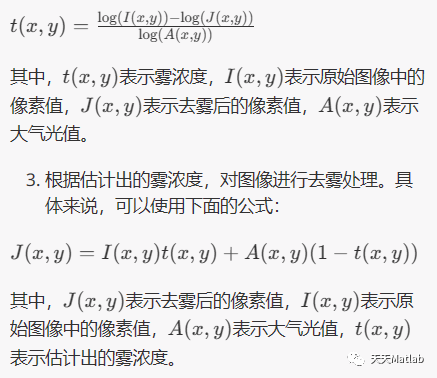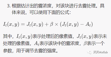根据估计出的雾浓度,对该块进行去雾处理。具体来说,可以使用下面的公式: