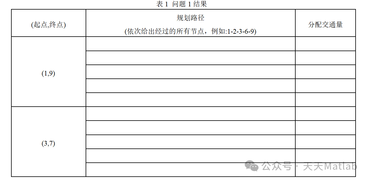 问题1:图2为一个小型交通网络。各(起点,终点)对之间的交通需求见附件1。请建立数学模型,给出各(起点,终点)对之间交通需求分配到对应路径上的交通量,使得网络中任意1条路段出现突发状况时(每个路段出现突发状况概率相同),网络中所有交通需求的期望可达率最大。在表1中填入指定(起点,终点)对规划的路径,以及对应分配的交通量(若规划路径数不足5条无需填满表格)。