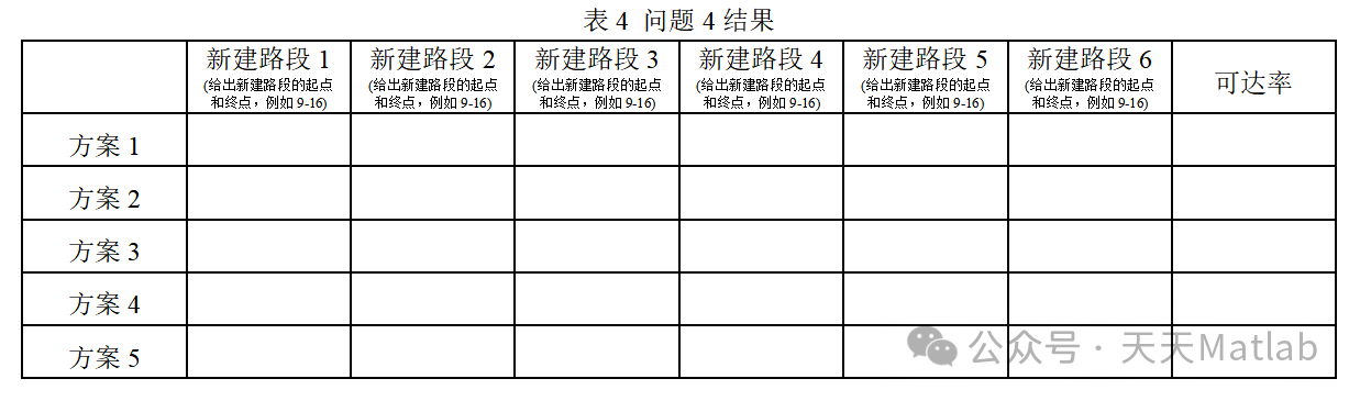 问题4:现计划在交通网络3中新修建6条路段(单向直线路段且长度为单位1,例如节点31至节点32),新建路段起点和终点必须是交通网络中的任意两个节点,并且假设新建路段的容量足够大。新建路段不能跨越其他路段(例如,不能在节点21与节点39之间修建路段),只能在网络内部修建(例如,不能在节点4与节点34之间修建路段)。请建立数学模型,给出新修建路段方案,使得在新网络中任意5条路段出现突发事故时(包括新建路段,每个路段出现突发状况概率相同),网络中所有交通需求的期望可达率尽可能最大,且交通需求分配到对应的路径后,各路段上的交通量不能超过路段容量(新建路段容量足够大,不用考虑这个因素)。在表4中填入期望可达率最大的5种方案及其可达率。
