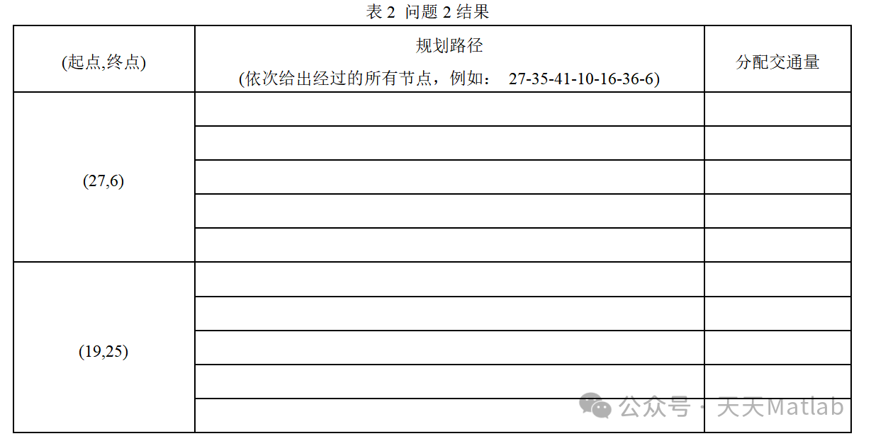 问题2:在图3所示的交通网络中,各(起点,终点)对之间的交通需求见附件2。请建立数学模型,给出各(起点,终点)对之间交通需求分配到对应路径上的交通量,使得网络中任意5条路段出现突发状况时(每个路段出现突发状况概率相同),网络中所有交通需求的期望可达率最大。在表2中填入指定(起点,终点)对规划的路径,以及对应分配的交通量(若规划路径数不足5条无需填满表格)。