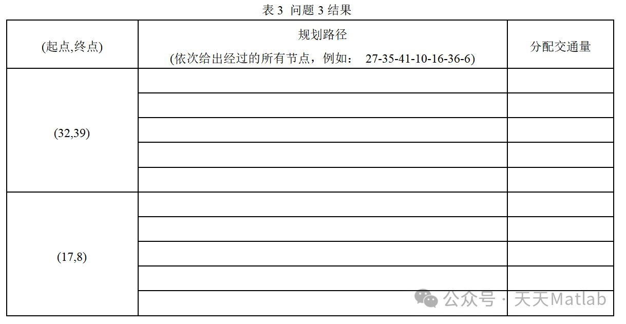 问题3:在交通网络3中,各(起点,终点)对之间的交通需求见附件2,各路段的容量上限见附件3。请建立数学模型,给出各(起点,终点)对之间交通需求分配到对应路径上的交通量,使得网络中任意5条路段出现突发状况时(每个路段出现突发状况概率相同),网络中所有交通需求的期望可达率最大,且交通需求分配到对应的路径后,各路段上的交通量不能超过路段容量(路段交通量计算方法:路段交通量=经过该路段的路径交通量之和。例如,路径1-0-6与路径1-0-3均经过路段1-0,则路段1-0交通量=路径1-0-6交通量+路径1-0-3交通量)。在表3中填入指定(起点,终点)对规划的路径,以及对应分配的交通量(若规划路径数不足5条无需填满表格)。