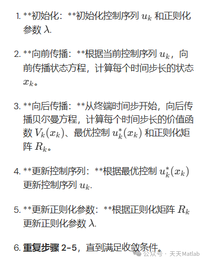 DDP 算法是一种动态规划算法,它通过迭代地求解每个时间步长的贝尔曼方程来求解最优控制问题。改进的 DDP 算法在传统 DDP 算法的基础上进行了改进,通过引入二次正则化项来避免算法的不稳定性。具体步骤如下: