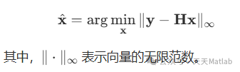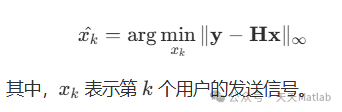 无限范数检测器的目标是寻找发送信号向量 𝑥x 的估计值 𝑥^x^,使得接收信号向量 𝑦y 与信道矩阵 𝐻H 乘以估计信号向量 𝑥^x^ 之间的差的无限范数最小化。该问题可以描述为以下优化问题:
