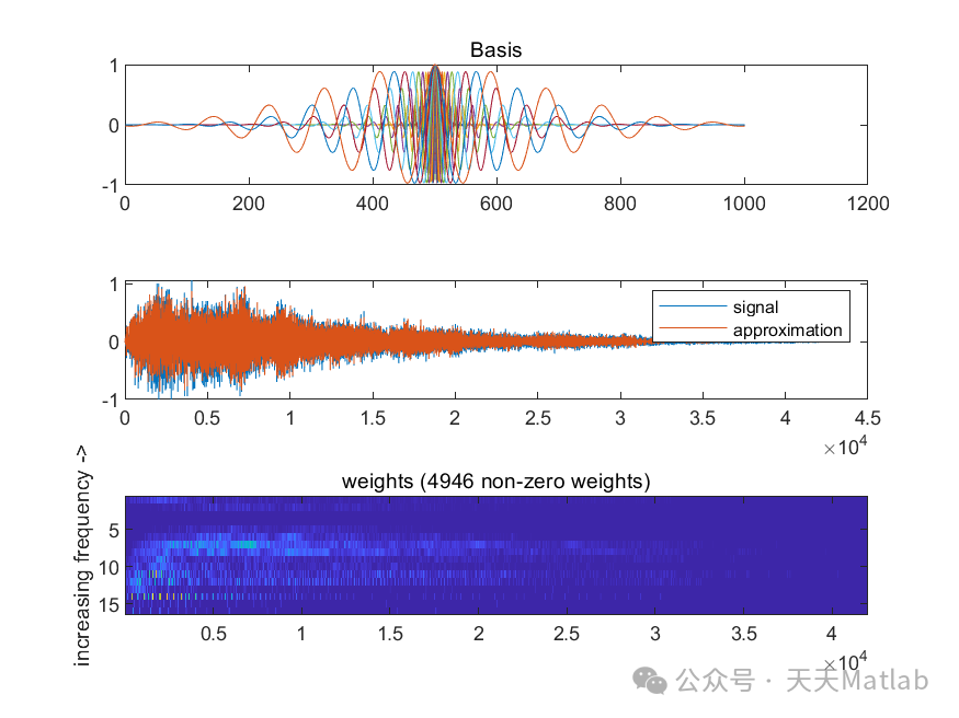 matchingPursuit()函数执行匹配追踪算法,得到匹配系数 coefficients 和匹配的基函数索引 indices。