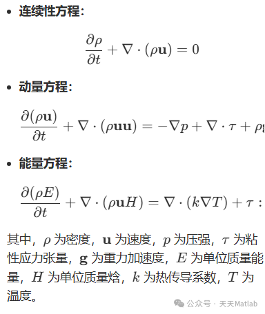 可压缩粘性流动通常由 Navier-Stokes 方程组描述,包括连续性方程、动量方程和能量方程: