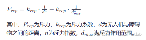 斥力场修正: 传统的斥力场计算方式可能导致斥力过强,使无人机在障碍物附近震荡,难以顺利通过。本文采用一种改进的斥力场计算方式,根据无人机与障碍物之间的距离动态调整斥力大小,避免斥力过强。具体公式如下: