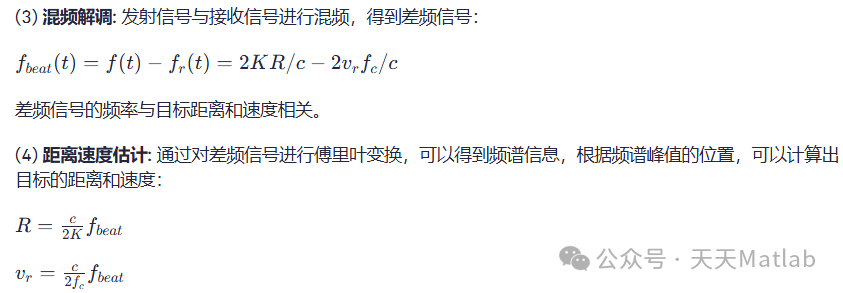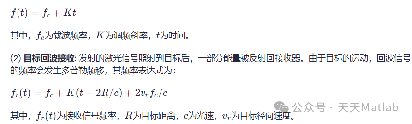 (1) 信号发射: 激光器发射线性调频连续波信号,其频率随时间线性变化,表达式为: