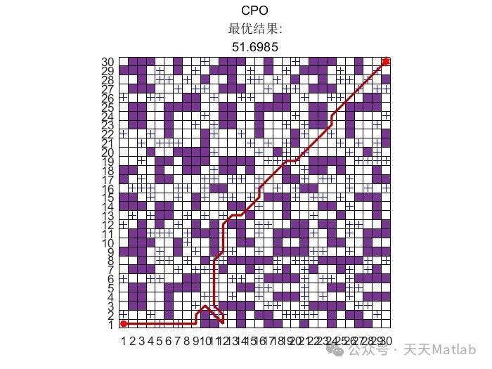 为了验证所提算法的有效性,我们进行了仿真实验。实验中,我们使用不同大小和复杂程度的栅格地图进行测试,并与传统的A算法进行了比较。实验结果表明,基于CPO的路径规划算法能够在大多数情况下找到接近最短路径的解,且在复杂地图环境中表现出更好的鲁棒性。同时,CPO算法的计算效率也优于A算法,尤其是在高维空间或地图规模较大的情况下。