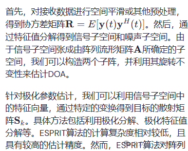 ESPRIT算法是一种基于旋转不变性的子空间算法,其核心思想是利用阵列流形矩阵的旋转不变性来估计信号参数。在极化MIMO雷达中,ESPRIT算法需要将接收数据进行特定的处理,以提取包含DOA和极化信息的旋转不变子空间。
