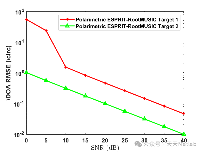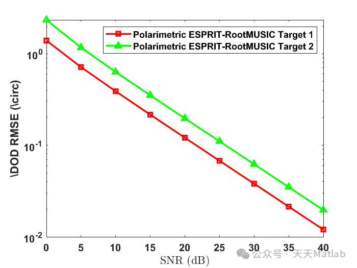 对于极化参数的估计,Root-MUSIC算法可以利用已估计的DOA,结合接收数据进行最小二乘法或其他优化算法的求解,得到目标的散射矩阵。Root-MUSIC算法具有较高的分辨率和抗干扰能力,尤其在低信噪比条件下表现出色。然而,Root-MUSIC算法的计算复杂度相对较高,且对噪声比较敏感。