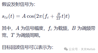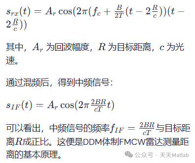 FMCW雷达发射线性调频信号,其频率随时间线性变化。当发射信号遇到目标后,会产生回波信号。由于目标与雷达之间的距离差,回波信号的频率与发射信号相比存在一个频差,这个频差与目标距离成正比。在DDM体制中,发射信号和接收回波信号均在混频器中与本地振荡器 (LO) 信号进行混频,实现下变频。由于LO信号与发射信号同频,混频后的中频信号包含了目标的距离信息,体现为一个与距离成正比的拍频信号。