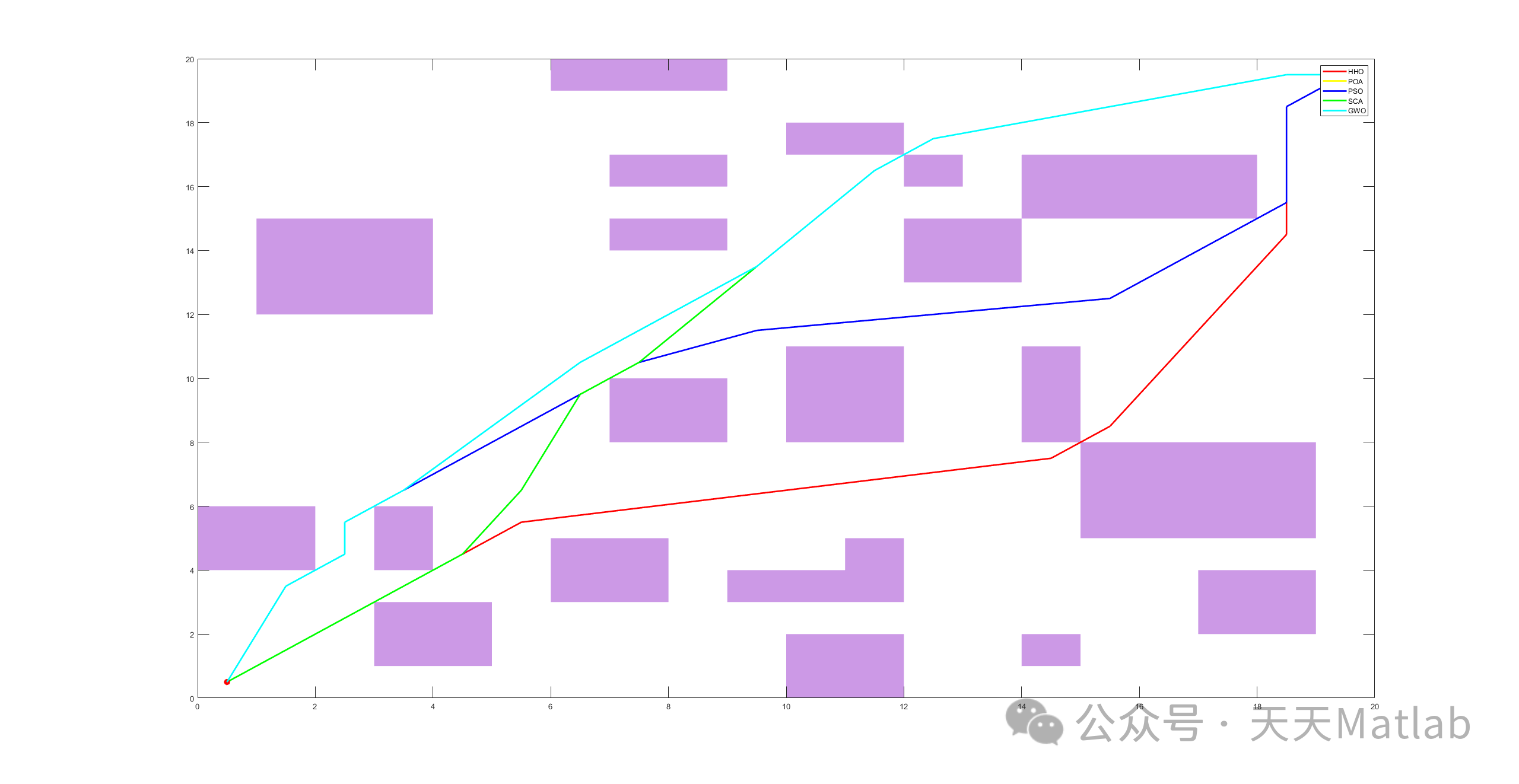 这五种算法都可以在路径规划中取得较好的效果,但其适用场景和性能表现有所不同。PSO算法适用于简单路径规划问题,其收敛速度快,但易陷入局部最优;GA算法适用于复杂路径规划问题,其全局搜索能力强,但收敛速度慢;DE算法兼具全局搜索能力和收敛速度,是较为均衡的选择;GWO算法和SSA算法近年兴起,其收敛速度相对较快,但其在复杂场景下的表现仍需进一步研究。 实际应用中,算法的选择应根据具体问题的复杂程度、约束条件以及计算资源等因素综合考虑。