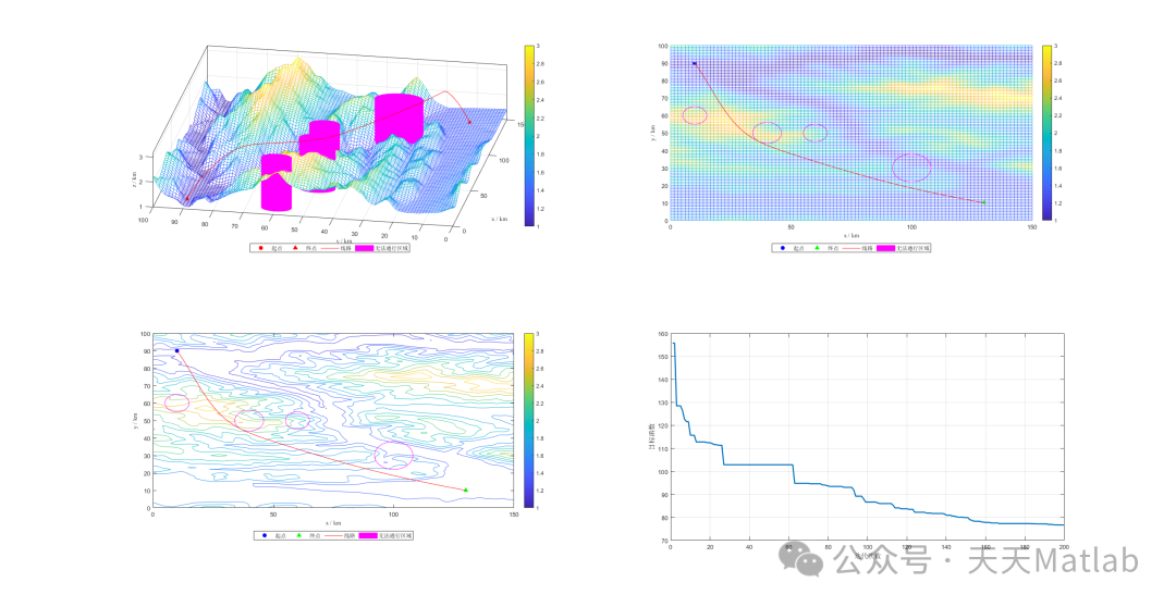 随着无人机技术的快速发展,其应用领域不断拓展,例如航拍测绘、环境监测、灾害救援等。在这些应用中,高效且安全的路径规划至关重要。无人机三维路径规划比二维路径规划更加复杂,需要考虑更多的因素,例如地形限制、障碍物规避、飞行高度限制以及能量消耗等。传统的路径规划算法,例如 A* 算法、Dijkstra 算法等,在处理高维复杂环境时效率较低,难以满足实际应用需求。近年来,基于群智能的优化算法,例如粒子群算法 (PSO)、遗传算法 (GA) 和麻雀算法 (SSA) 等,因其全局搜索能力强、易于实现等优点,被广泛应用于无人机路径规划中。
