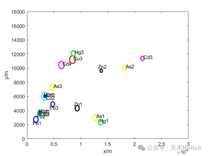(6) 假设x轴增大的方向为东方,y轴增大的方向为北方,设定方向只为叙述方便,方向不影响重金属含量分布情况。