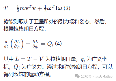 2.2 拉格朗日方法拉格朗日方法提供了一种基于能量的动力学建模方法。首先,我们需要定义系统的动能 𝑇T 和势能 𝑉V。对于卫星系统,动能包括平动动能和转动动能: