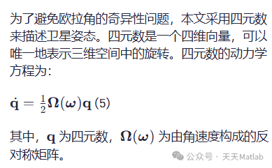 为了避免欧拉角的奇异性问题,本文采用四元数来描述卫星姿态。四元数是一个四维向量,可以唯一地表示三维空间中的旋转。四元数的动力学方程为: