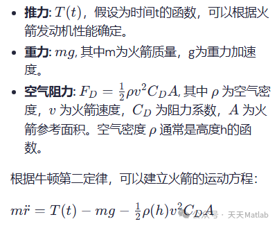 火箭的飞行过程是一个复杂的动力学过程,受到重力、推力、空气阻力等多种因素的影响。为了简化模型,本文采用点质量模型,忽略火箭姿态变化的影响。考虑以下因素: