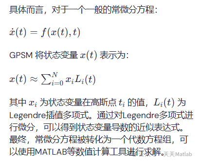 高斯伪谱法基于Legendre多项式或Chebyshev多项式,将状态变量在时间或空间域上用这些多项式的线性组合来逼近。该方法的关键在于选择高斯点作为求解节点,这些节点是对应多项式的根。在这些高斯点上,对微分方程进行离散化,转化为代数方程组进行求解。相比于有限差分法,GPSM具有更高的精度和效率,特别是在求解具有高阶导数和复杂边界条件的问题时。