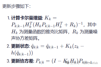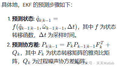 在 EKF 框架下,我们需要进行状态预测和状态更新两个步骤。状态预测阶段,利用航天器姿态动力学方程预测下一时刻的状态。状态更新阶段,结合传感器测量值和预测值,利用卡尔曼增益更新状态估计。EKF 的核心在于线性化过程,即通过对非线性函数进行一阶泰勒展开,计算雅克比矩阵,用于逼近非线性系统的线性化模型。